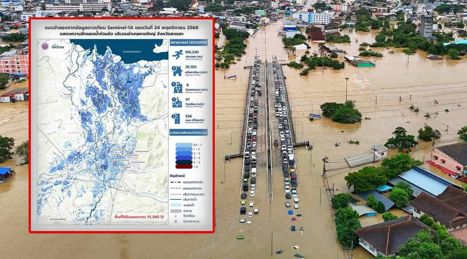 ข้อมูลจาก GISTDA วิเคราะห์ด้วยภาพถ่ายดาวเทียม Sentinel-1A และแบบจำลอง HAND ระบุว่าพื้นที่ส่วนใหญ่ของหาดใหญ่อยู่ใน “โซนสีน้ำเงินเข้ม” น้ำลึกเฉลี่ย 2–3 เมตร บางจุดเป็น “โซนเข้มจัด” มีความลึกมากกว่า 4 เมตร