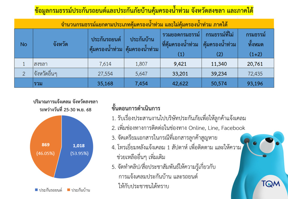 “ขณะนี้ก็ได้มอบหมายให้น้องๆของบริษัททีคิวเอ็มทำหน้าที่ประสานงานกับลูกค้าไปแล้วระดับหนึ่ง ก็ต้องขอขอบคุณที่ทุกคนเข้าใจ ซึ่งส่วนใหญ่คนทางใต้หลายจังหวัดที่น้ำท่วม รวมถึงหาดใหญ่ใจดีจะไม่ว่าอะไรเรา บอกพี่ๆรอนิดนะ เขาก็เข้าใจ เพียงแต่เค้าต้องการเพียงให้มีคนมารับแจ้งเคลม ทำให้เขารู้สึกไม่เคว้งคว้างเท่านั้นเองก็พอใจแล้ว เชื่อว่าตัวเลขความเสียหายคงจะเข้ามาชัดเจนอีกไม่กี่วันนี้