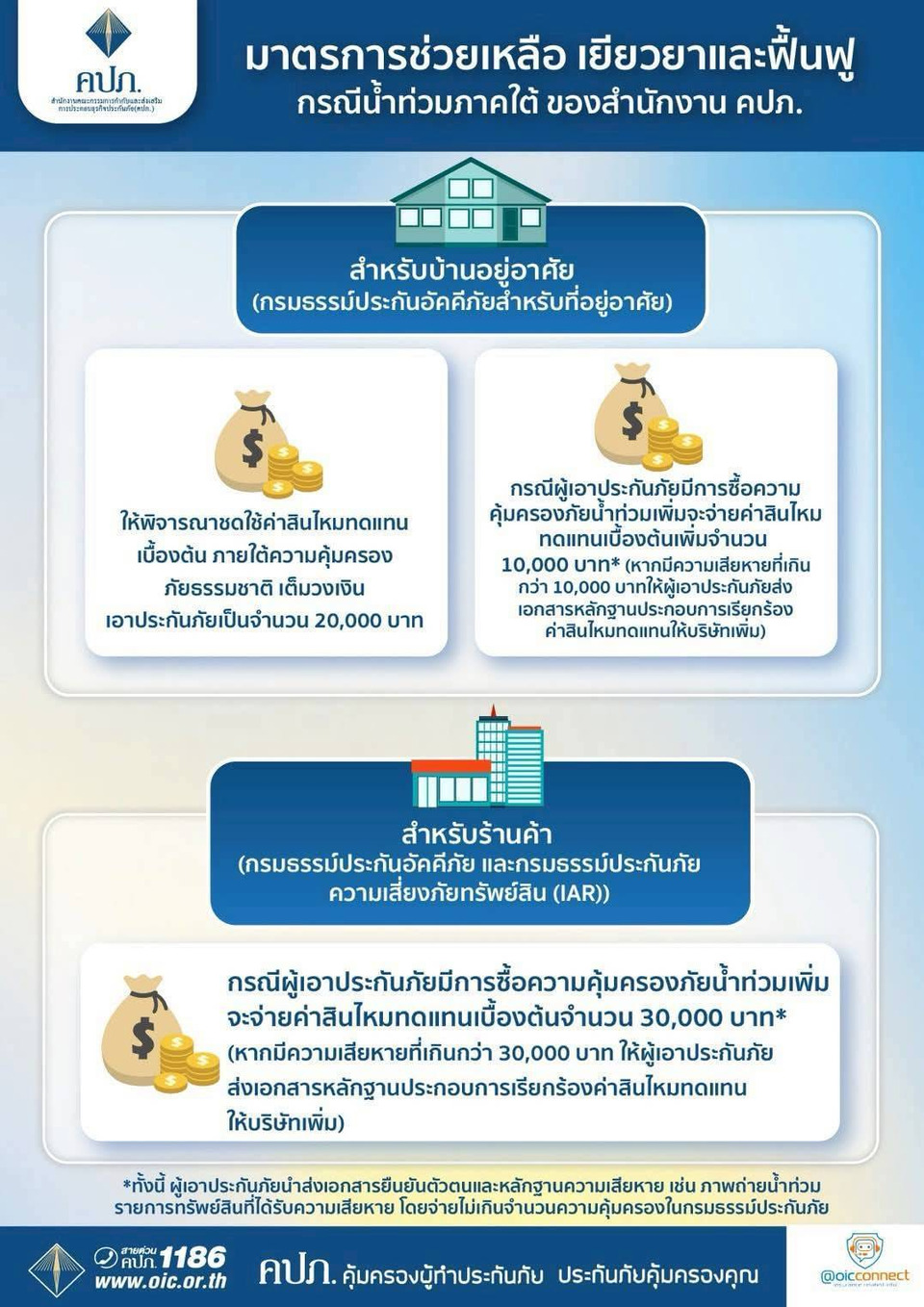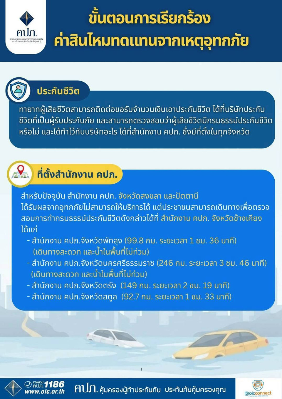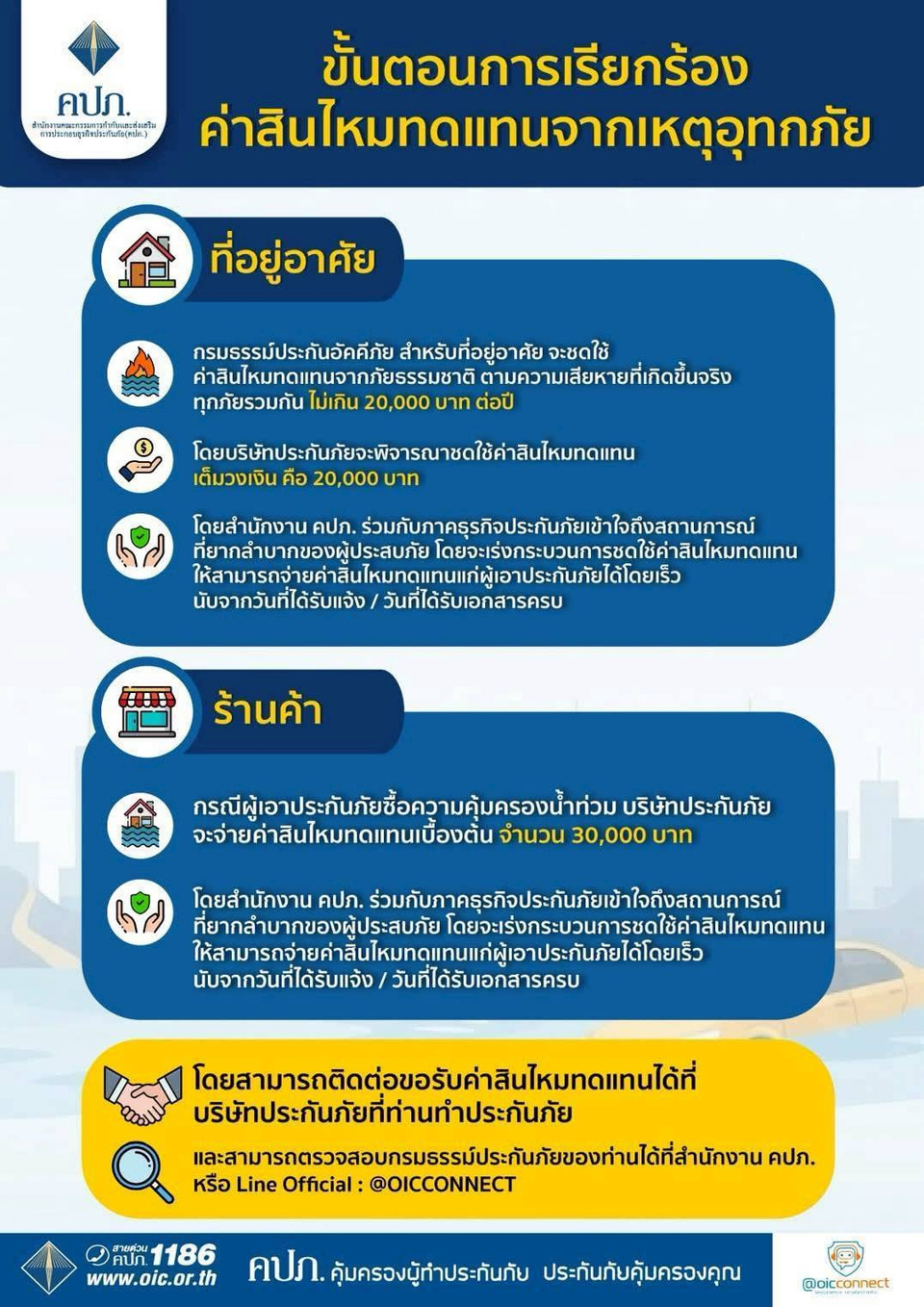 ทั้งนี้สำนักงานคปภ.จะร่วมกับภาคธุรกิจประกันภัยและเข้าใจถึงสถานการณ์ที่ยากลำบากของผู้ประสบภัย โดยจะเร่งกระบวนการชดใช้ค่าสินไหมทดแทนให้สามารถจ่ายค่าสินไหมทดแทนแก่ผู้เอาประกันภัยได้โดยเร็ว นับจากวันที่ได้รับแจ้ง /วันที่ได้รับเอกสารครบ โดยสามารถติดต่อขอรับค่าสินไหมทดแทนได้ที่ บริษัทประกันภัยที่ท่านทำประกันภัย และสามารถตรวจสอบกรมธรรม์ประกันภัยของท่านได้ที่สำนักงานคปภ.หรือ Line Official@OICCONNECT