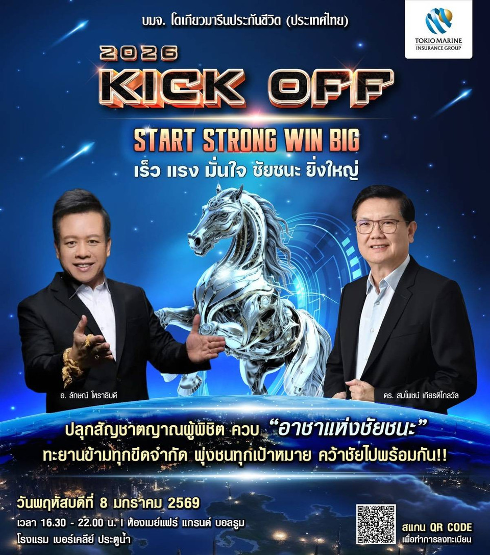 ขณะที่วันนี้ค่ายโตเกียวมารีนประกันชีวิตก็จุดพลุจัดงานคิกออฟนักขายกว่า 500 ชีวิตที่ร่วมงานในวันพฤหัสบดีที่ 8 มกราคม 2569 เวลา 16.30 -22.00 น. ณ ห้องเมย์แฟร์ แกรนด์ บอลรูม โรงแรมเมอร์เคลีย์ ประตูน้ำ ภายใต้สโลแกน START STRONG WIN BIG หรือเร็ว แรง มั่นใจ ชัยชนะ ยิ่งใหญ่ โดยงานนี้ดร.สมโพชน์ เกียรติไกรวัล บิ๊กบอสใหญ่ควงอ.ลักษณ์ โหราธิบดี มาปลุกสัญชาตผู้พิชิต ควบ “อาชาแห่งชัยชนะ” ทะยานเข้มทุกขีดจำกัด พุ่งชนทุกเป้าหมาย คว้าไปพร้อมกัน!!!