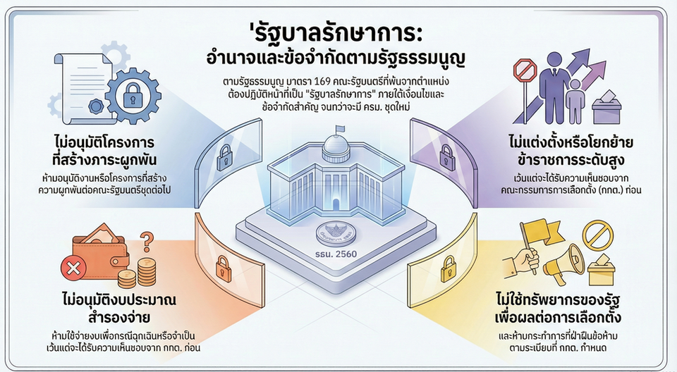 ส่วน มาตรา 169 กำหนดข้อห้ามว่า ด้วยเรื่องสำคัญๆ สำหรับรัฐบาลรักษาการไว้ ได้แก่