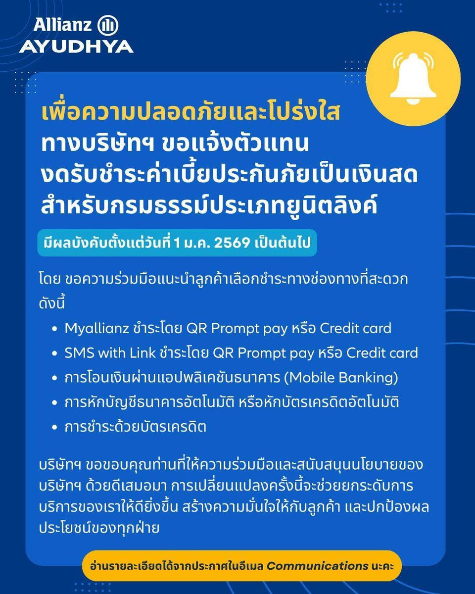 ถือเป็นนโยบายสกัดไฟแต่ต้นลมทีเดียว เมื่อเปิดศักราชใหม่ต้นปีก็มีการประกาศออกมาเข้มงวดขึ้นทันควัน เพื่อเป็นการเซฟตี้เงินค่าเบี้ยประกันลูกค้าที่ต้องชำระจ่ายให้กับค่ายอลิอันซ์ อยุธยา ประกันชีวิต โดยบริษัทประกาศงดรับชำระค่าเบี้ยประกันภัยเป็นเงินสดสำหรับกรมธรรม์ประเภทยูนิตลิงค์ ตั้งแต่วันที่ 1 มกราคม 2569 เป็นต้นไป แม้หลายปีมานี้อลิอันซ์ อยุธยาฯจะยืนยันว่า ไม่ได้ประกาศให้งดจ่ายเบี้ยเป็นเงินสด แต่เป็นเพียงแต่เน้นให้ชำระผ่านช่องทางออนไลน์ที่สะดวก เช่น ลิงก์ SMS, แอป My Allianz, หรือ Mobile Banking (ยกเว้นบางธนาคาร) เพื่อความปลอดภัยและความสะดวก
