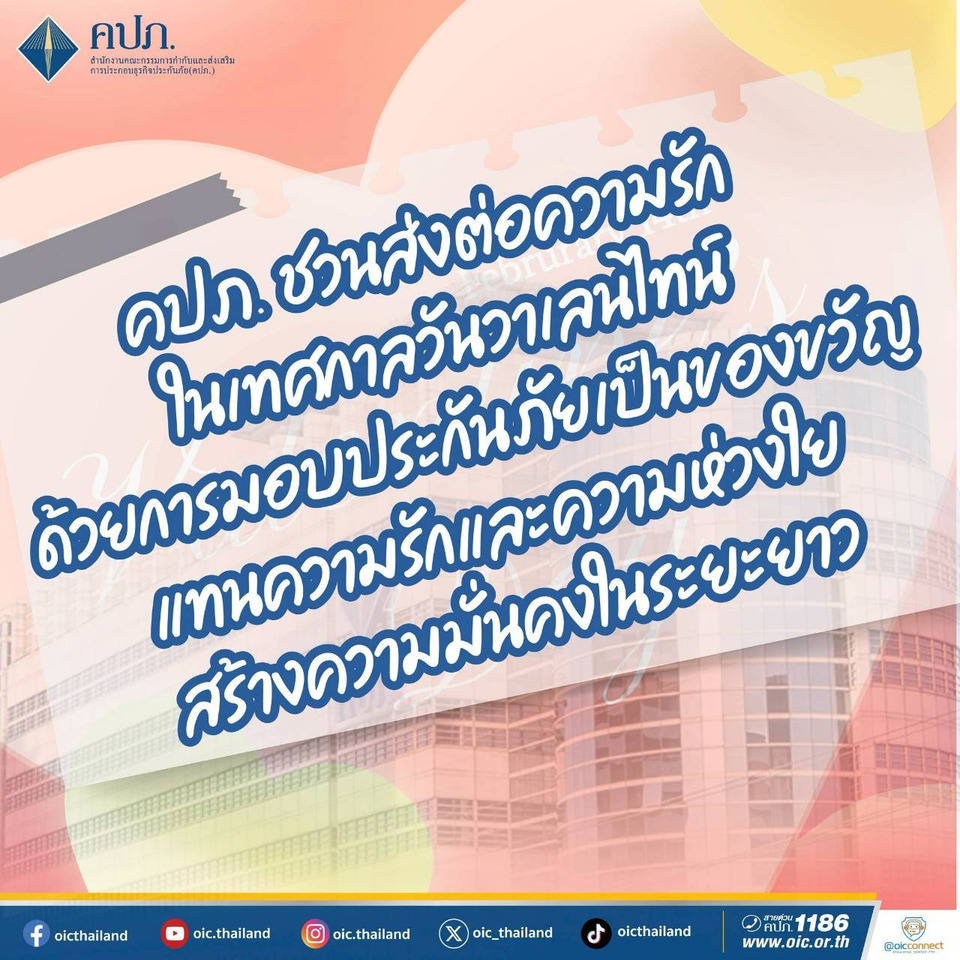 ส่วนทางด้านสำนักงานคณะกรรมการกำกับและส่งเสริมการประกอบธุรกิจประกันภับ(คปภ.) ออกมาชวนส่งต่อความรักวันวาเลนไทน์ มอบประกันภัยเป็นของขวัญ โดยชวนให้พี่น้องปชช.ร่วมเป็นส่วนหนึ่งในการเฉลิมฉลองเทศกาลแห่งความรัก ด้วยการเชิญชวนประชาชนเปลี่ยนความรักและความห่วงใยให้เป็นหลักประกันความมั่นคงในระยะยาว ผ่านการมอบผลิตภัณฑ์ประกันภัยเป็นของขวัญที่มีคุณค่า เพื่อสื่อแทนคำบอกรักและ ความห่วงใยอย่างยั่งยืน โดยมีผลิตภัณฑ์ประกันภัยให้เลือกหลากหลายไม่ว่าจะเป็นการประกันชีวิต
