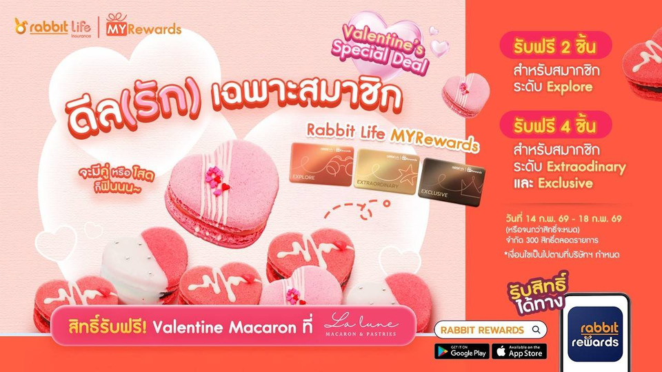 ส่วนค่ายแรบบิท ประกันชีวิตในเครือบริษัท บีทีเอส กรุ๊ป โฮลดิ้งส์ จำกัด (มหาชน) ได้ชวนเติมโมเมนต์หวานต้อนรับเทศกาลวาเลนไทน์ ชวนลูกค้าสมาชิก Rabbit Life MYRewards ทุกระดับร่วมเอ็นจอยความสุขในช่วงเทศกาลแห่งความรัก ด้วยของขวัญสุดเอ็กซ์คลูซีฟแทนคำขอบคุณ กับมาการองรูปหัวใจ Collection Valentine “Hearts in Blooms” จาก La Lune Macaron (เฉพาะสาขาที่ร่วมรายการ) ให้ทุกสถานะได้ลิ้มรสความหวานอย่างมีสไตล์ อาทิ สมาชิกระดับ Explore: รับฟรี Valentine Macaron 2 ชิ้น มูลค่า 140 บาท สมาชิกระดับ Extraordinary: รับฟรี Valentine Macaron 4 ชิ้น มูลค่า 280 บาท สมาชิกระดับ Exclusive: รับฟรี Valentine Macaron 4 ชิ้น มูลค่า 280 บาทให้เทศกาลแห่งความรักปีนี้ หวานละมุนกว่าที่เคย โดยสมาชิก Rabbit Life MYRewards สามารถกดรับสิทธิ์แลกของขวัญผ่านแอปฯ Rabbit Life MYRewards ได้ตั้งแต่วันที่ 14 – 18 กุมภาพันธ์ 2569 (สิทธิ์มีจำนวนจำกัด) สำหรับผู้ที่สนใจสามารถเข้าไปศึกษาเพิ่มเติม รวมถึงอัปเดตข้อมูลข่าวสาร และโปรโมชันต่าง ๆ ได้ที่เว็บไซต์ Rabbit Life www.rabbitlife.co.th