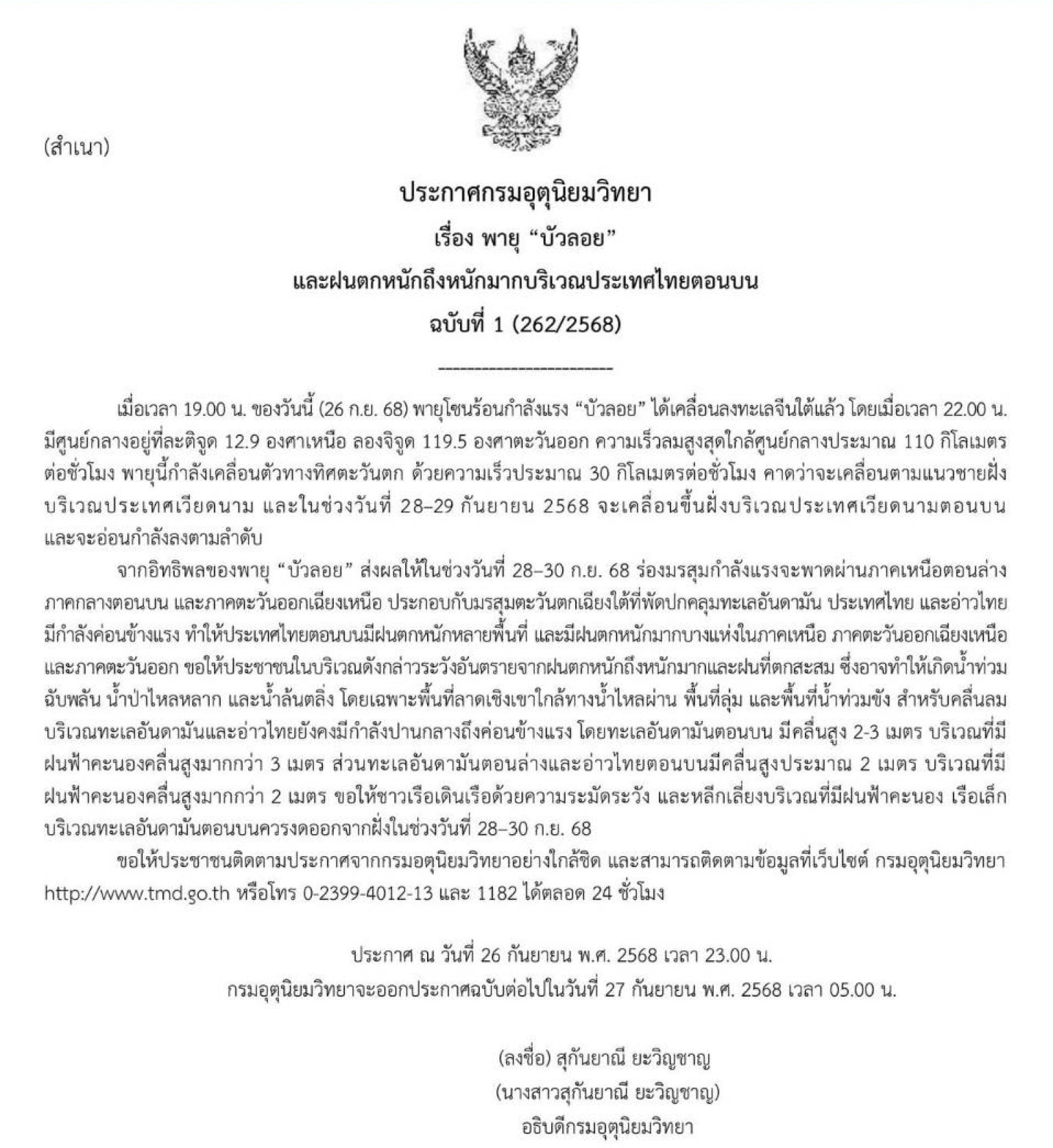 กรมอุตุนิยมวิทยาออกประกาศเตือนฉบับที่ 1 (262/2568) เรื่องพายุโซนร้อนกำลังแรง “บัวลอย” ซึ่งจะส่งผลให้ประเทศไทยตอนบนมีฝนตกหนักถึงหนักมากในหลายพื้นที่ ระหว่างวันที่ 28–30 กันยายน 2568 โดยเฉพาะภาคเหนือ ภาคตะวันออกเฉียงเหนือ และภาคตะวันออก