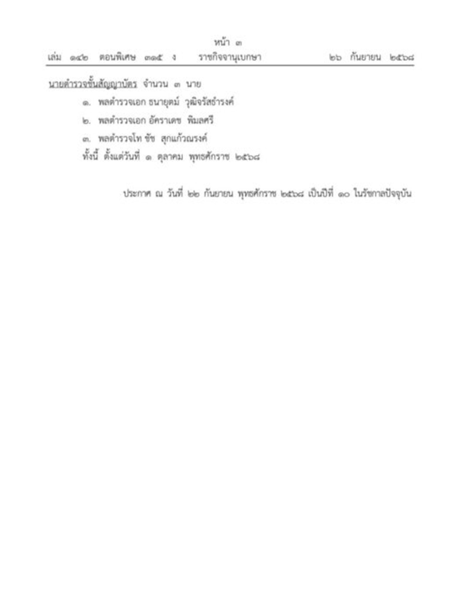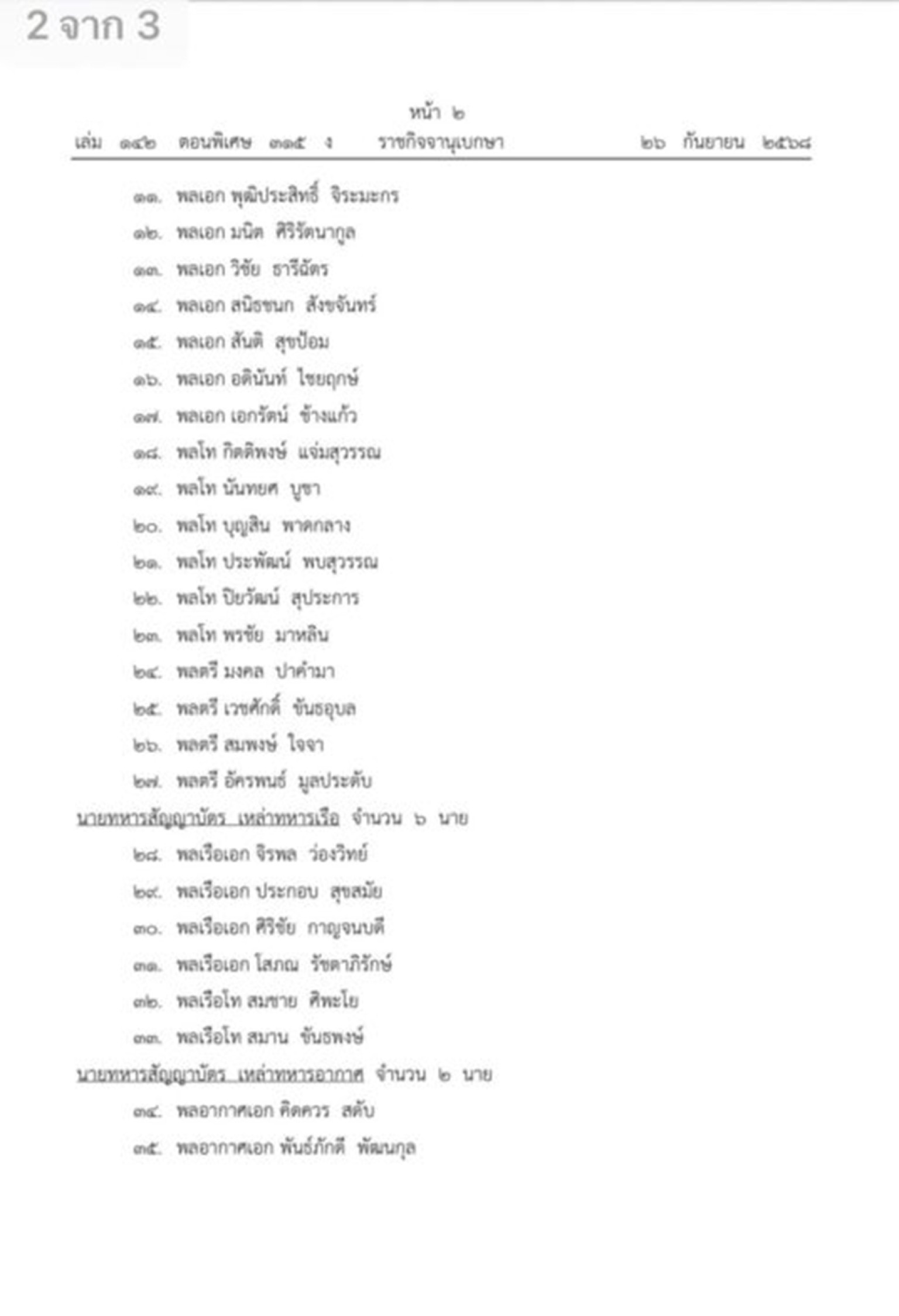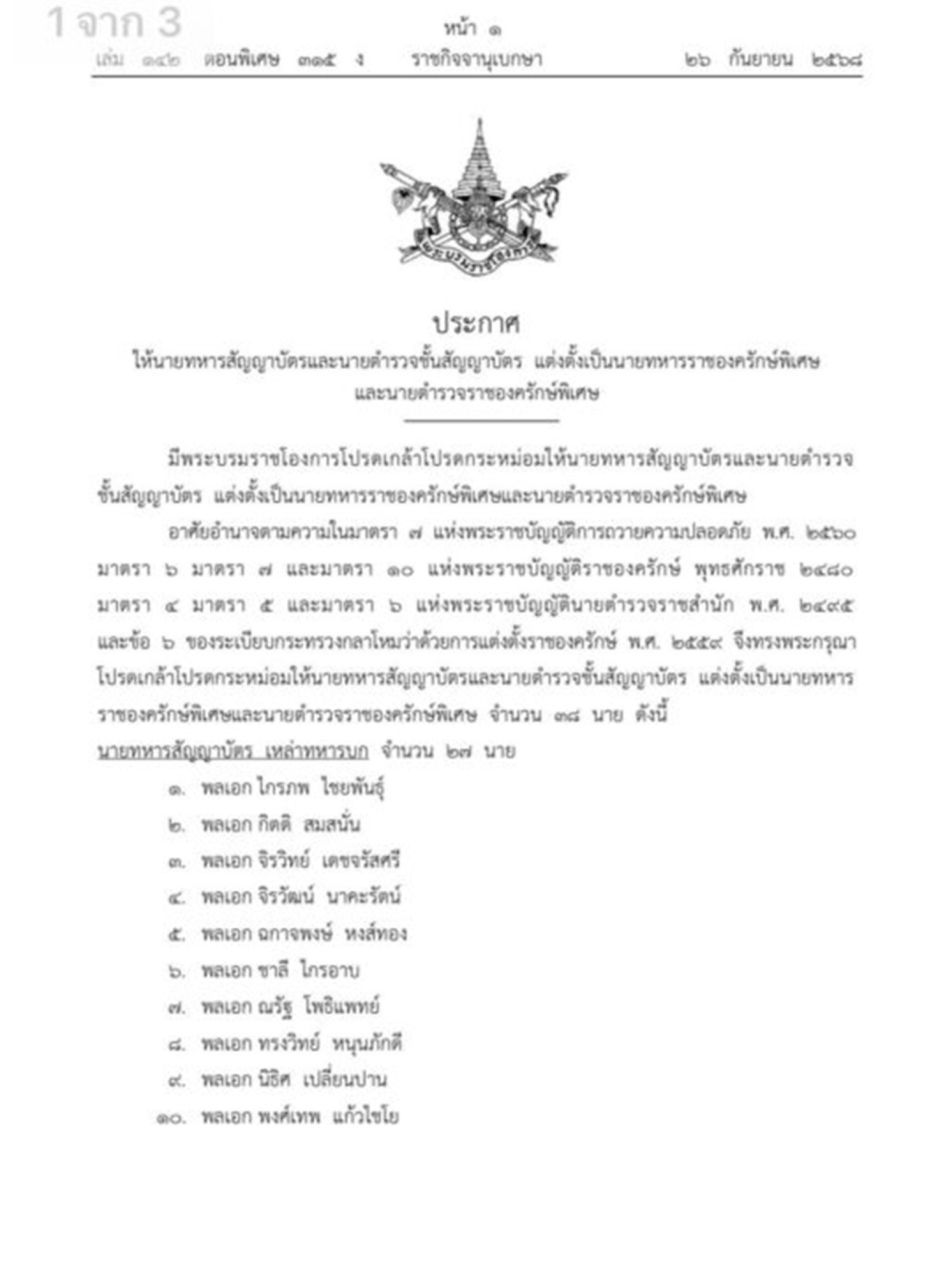 เมื่อวันที่ 27 ก.ย.68 เว็บไซต์ราชกิจจานุเบกษา เผยแพร่ประกาศให้นายทหารสัญญาบัตรและนายตำรวจชั้นสัญญาบัตร แต่งตั้งเป็นนายทหารราชองครักษ์พิเศษและนายตำรวจราชองครักษ์พิเศษ มีพระบรมราชโองการโปรดเกล้าโปรดกระหม่อมให้นายทหารสัญญาบัตรและนายตำรวจชั้นสัญญาบัตร แต่งตั้งเป็นนายทหารราชองครักษ์พิเศษและนายตำรวจราชองครักษ์พิเศษ