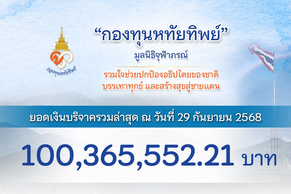 ล่าสุดวันนี้ (30 ก.ย.68) เพจ กองทุนหทัยทิพย์ ได้รายงานยอดเงินบริจาครวมล่าสุด ณ วันที่ 29 กันยายน 2568 มียอดเงินบริจาคสมทบ “กองทุนหทัยทิพย์” ภายใต้มูลนิธิจุฬาภรณ์ รวม 100,365,552.21 บาท