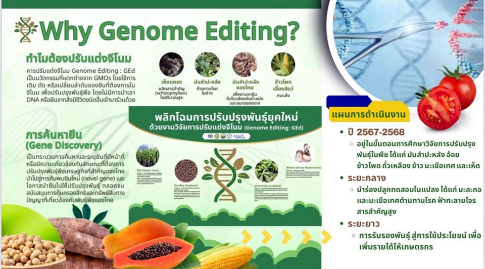• เทคโนโลยี Genome Editing (การปรับแต่งจีโนม) หรือ GEd ที่ไม่ใช่ GMOs มีความปลอดภัยต่อผู้บริโภค เนื่องจากไม่ได้มีการนำยืนจากสิ่งมีชีวิตอื่นมาผสม แต่เป็นการปรับปรุงพันธุกรรมภายในชนิดพืชนั้นเอง