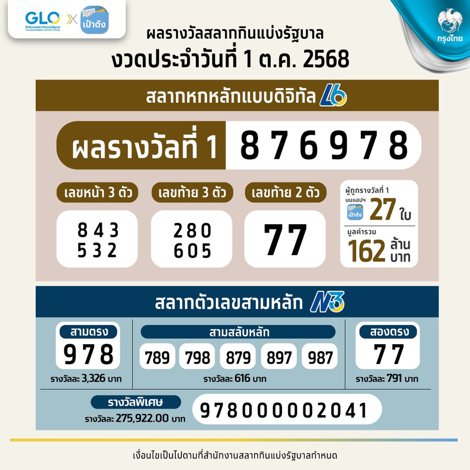 สลากดิจิทัล L6 งวดประจำวันที่ 01 ต.ค. 68