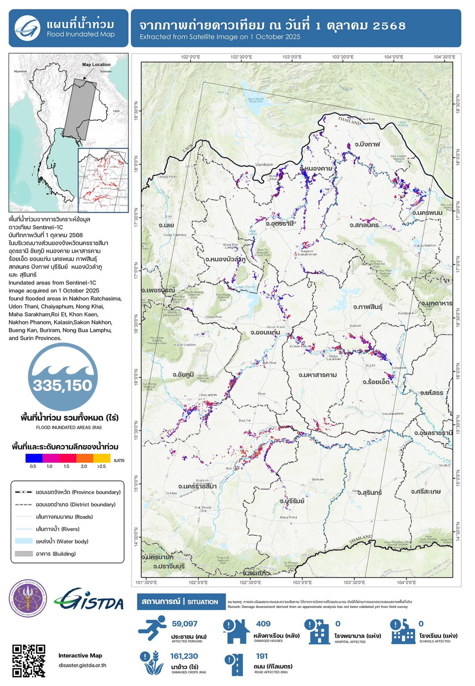 วันที่ 1 ต.ค.68 กระทรวงการอุดมศึกษา วิทยาศาสตร์ วิจัยและนวัตกรรม (อว.) โดย GISTDA ติดตามสถานการณ์น้ำท่วมขังด้วยข้อมูลจากดาวเทียม Sentinel-1C ของวันที่ 1 ต.ค.8 พบว่าขณะนี้มีพื้นที่บางส่วนของจังหวัด #นครราชสีมา #อุดรธานี #ชัยภูมิ #หนองคาย #มหาสารคาม #ร้อยเอ็ด #ขอนแก่น #นครพนม #กาฬสินธุ์ #สกลนคร #บึงกาฬ #บุรีรัมย์ #หนองบัวลำภู และ #สุรินทร์ รวม 14 จังหวัด มีพื้นที่ที่ได้รับผลกระทบจากน้ำท่วมขังทั้งสิ้น 335,150 ไร่ ส่วนใหญ่เป็นพื้นที่ลุ่มต่ำ พื้นที่การเกษตร พื้นที่ริมสองฝั่งแม่น้ำสายหลักและสายรอง รวมถึงชุมชนที่อยู่อาศัยและเส้นทางคมนาคมบางส่วน ทั้งนี้ ระดับน้ำท่วมขังจะมีความลึกแตกต่างกันไปตามลักษณะของแต่ละพื้นที่