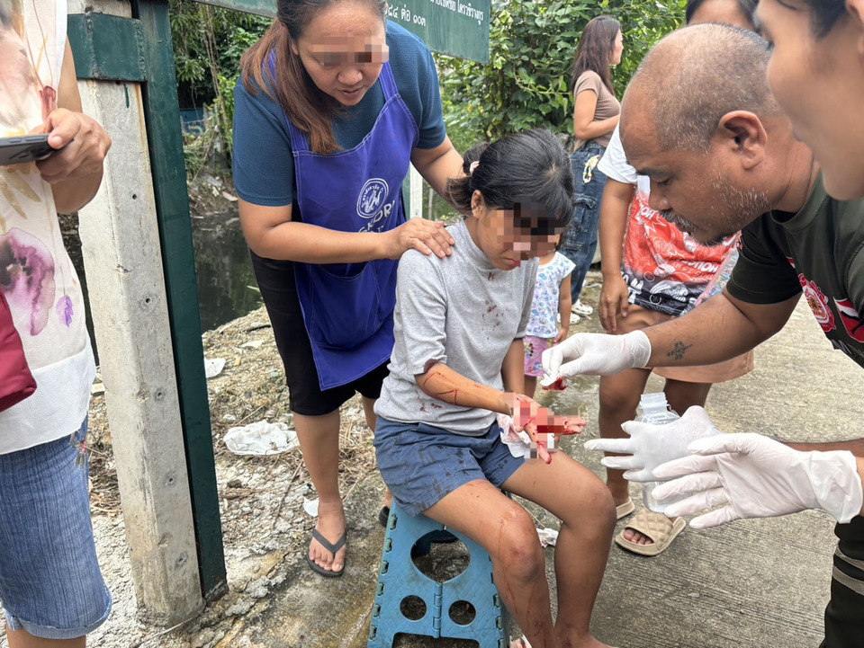 ด้าน นางสาวเอ (นามสมมุติ) อายุ 15 ปี ลูกสาวและผู้บาดเจ็บ เล่าให้ฟังว่า ตอนแรกเจ้าตัวไม่ได้อยู่ที่นี่ แต่อยู่ที่สถานสงเคราะห์จังหวัดปัตตานี อาศัยอยู่ที่นั่นได้ 8 ปีแล้ว แต่ได้หนีออกมา ขึ้นรถไฟมา ลงหัวลำโพง แล้วก็ต่อรถมอเตอร์ไซค์มาที่นี่ ตอนที่เกิดเหตุ ตนเล่นอยู่กับน้องข้างบ้าน ตอนนั้นพ่อเรียกใช้งานตน แต่ตนไม่ไป พ่อเลยโมโห เขาใช้เลื่อยฟันตน จนได้รับบาดเจ็บ เขาทำแบบนี้มา 3 รอบแล้ว เขาเป็นพ่อแท้ๆของตน