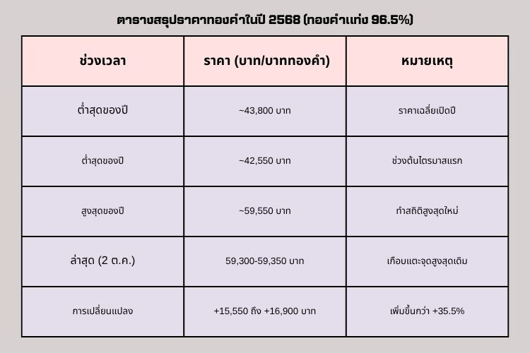 จากราคาต้นปีราว 43,800 บาทต่อบาททองคำ ได้ทะยานขึ้นมาแตะ 59,550 บาทในเวลาเพียงเก้าเดือน หรือเพิ่มขึ้นกว่า 35% แรงกว่าหุ้นไทยแทบทุกตัว และเหนือกว่าผลตอบแทนตราสารหนี้อย่างสิ้นเชิง