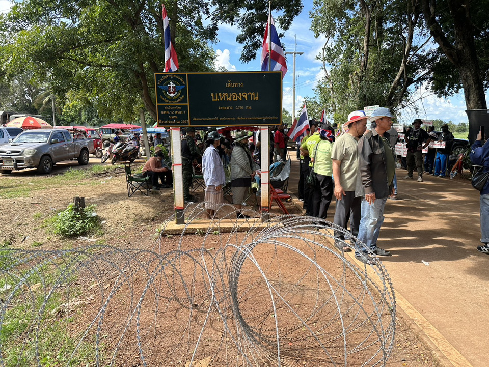จากนั้นเวลาประมาณ 14.30 น. คณะฯ ได้เดินทางลงพื้นที่บ้านหนองจาน บริเวณหลักเขตแดนที่ 46-47 ซึ่งเคยเป็นพื้นที่ศูนย์อพยพกัมพูชาเดิม เมื่อ 40 ปีที่แล้วและอยู่ตรงข้ามบ้านโจกเจย จังหวัดบันเตียเมียนเจย ประเทศกัมพูชา ซึ่งบริเวณบ้านหนองจานมีมวลชนชาวไทย ประมาณ 80-100 คน มาแสดงสัญลักษณ์และให้กำลังใจ กำลังพลที่ปฎิบัติหน้าที่แนวชายแดนไทย-กัมพูชา โดยใช้เวลาประมาณ 1 ชั่วโมงสำหรับการตรวจสอบพื้นที่ดังกล่าว หลังจากตรวจสอบพื้นที่ทั้งหมดแม่ทัพภาคที่ 1 กล่าวว่า การลงพื้นที่ชายแดนครั้งนี้ก็เพื่อดูสถานการณ์ชายแดนและมอบนโยบายให้เจ้าหน้าที่ปฏิบัติแนวชายแดนด้วยความเข้มแข็งและยึดตามนโยบายของรัฐบาลอย่างเข้มงวด