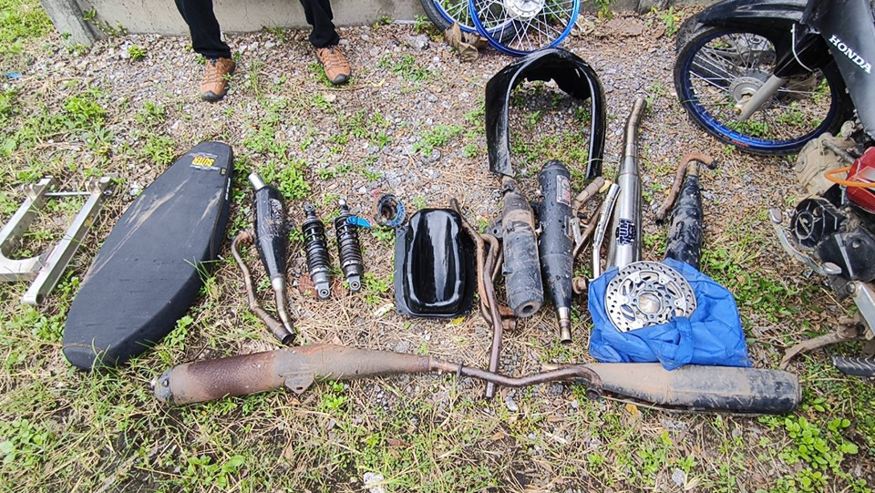 หลังรวบรวมหลักฐาน เจ้าหน้าที่นำกำลังไปจับกุมผู้ต้องหาทั้ง 4 รายได้ในพื้นที่ อ.ศรีมหาโพธิ จ.ปราจีนบุรี พบของกลางหลายรายการ อาทิ รถจักรยานยนต์ 3 คัน อะไหล่ชิ้นส่วนต่าง ๆ ได้แก่ ปลายท่อ 7 ชิ้น วงล้อ 5 วง จานดิสเบรก ปั๊มเบรก โช๊คอัพ และแบตเตอรี่ ฯลฯ