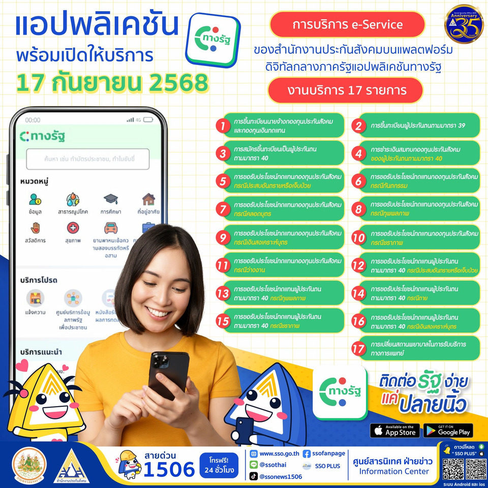 โดยผู้ประกันตนสามารถใช้บริการ e-Service ของสำนักงานประกันสังคมบนแพลตฟอร์มดิจิทัลกลางภาครัฐ แอปพลิเคชัน “ทางรัฐ” ในงานบริการถึง 17 รายการ คือ 1) การขึ้นทะเบียนนายจ้างกองทุนประกันสังคมและกองทุนเงินทดแทน 2) การขึ้นทะเบียนผู้ประกันตนตามมาตรา 39 3) การสมัครขึ้นทะเบียนเป็นผู้ประกันตนตามมาตรา 40 4) การชำระเงินสมทบกองทุนประกันสังคมของผู้ประกันตนมาตรา 40 5) การขอรับประโยชน์ทดแทนกองทุนประกันสังคม กรณีประสบอันตรายหรือเจ็บป่วย 6) การขอรับประโยชน์ทดแทนกองทุนประกันสังคม กรณีทันตกรรม 7) การขอรับประโยชน์ทดแทนกองทุนประกันสังคมกรณีคลอดบุตร การขอรับประโยชน์ทดแทนกองทุนประกันสังคมกรณีทุพพลภาพ 9) การขอรับประโยชน์ทดแทนกองทุนประกันสังคมกรณีเงินสงเคราะห์บุตร 10) การขอรับประโยชน์ทดแทนกองทุนประกันสังคมกรณีชราภาพ 11) การขอรับประโยชน์ทดแทนกองทุนประกันสังคมกรณีว่างงาน 12) การขอรับประโยชน์ทดแทนผู้ประกันตนตามมาตรา 40 กรณีประสบอันตรายหรือเจ็บป่วย 13) การขอรับประโยชน์ทดแทนผู้ประกันตนตามมาตรา 40 กรณีทุพพลภาพ 14) การขอรับประโยชน์ทดแทนผู้ประกันตนตามมาตรา 40 กรณีตาย 15) การขอรับประโยชน์ทดแทนผู้ประกันตนตามมาตรา 40 กรณีชราภาพ 16) การขอรับประโยชน์ทดแทนผู้ประกันตนตามมาตรา 40 กรณีเงินสงเคราะห์บุตร 17) การเปลี่ยนสถานพยาบาลในการรับบริการทางการแพทย์