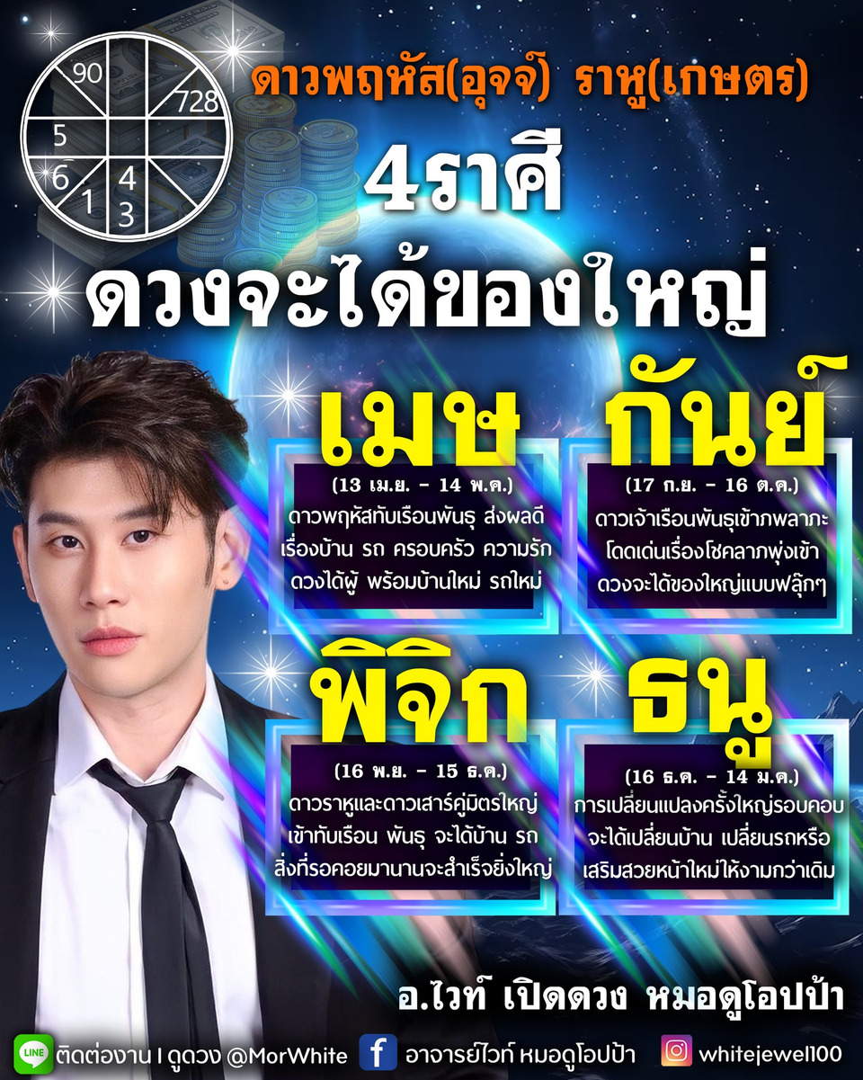 วันที่ 4 ต.ค.68 อาจารย์ไวท์ หมอดูโอปป้า นักพยากรณ์ชื่อดัง โพสต์ข้อความผ่านเฟซบุ๊ก "อาจารย์ไวท์ หมอดูโอปป้า" ระบุว่า ดาวพฤหัส (อุจจ์) ราหู (เกษตร) 4 ราศี ดวงจะได้ของใหญ่