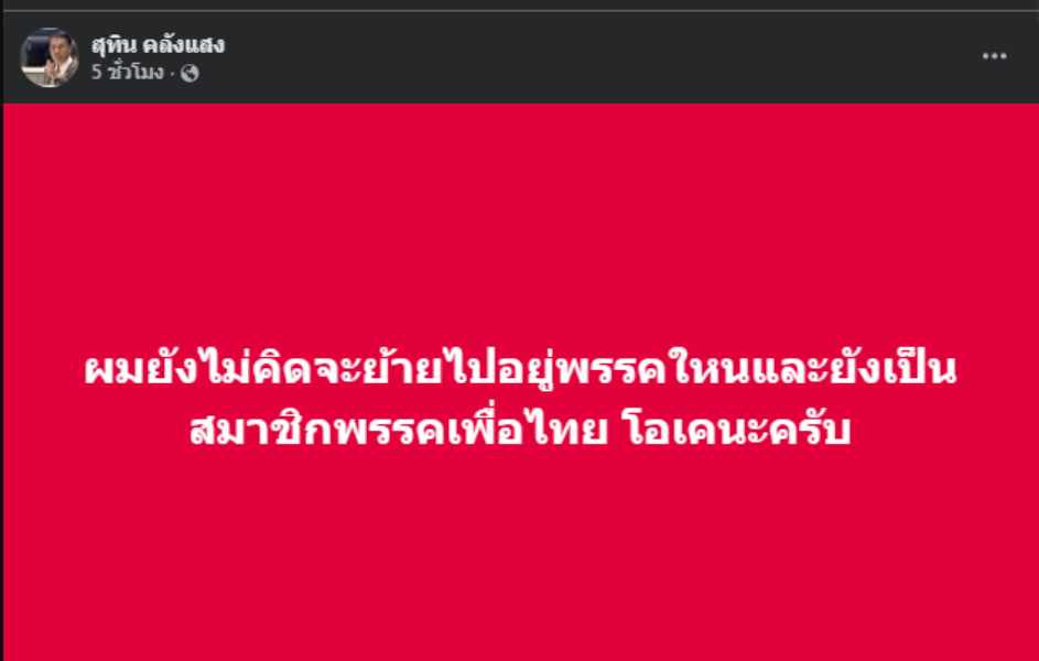 ผมยังไม่คิดจะย้ายไปอยู่พรรคใหนและยังเป็นสมาชิกพรรคเพื่อไทย โอเคนะครับ