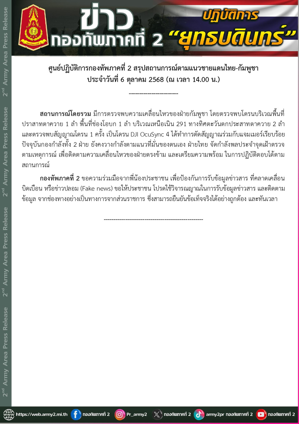 วันที่ 6 ต.ค.68 ศูนย์ปฏิบัติการกองทัพภาคที่ 2 สรุปสถานการณ์ตามแนวชายแดนไทย-กัมพูชา ประจำวันที่ 6 ตุลาคม 2568 (ณ เวลา 14.00 น.)