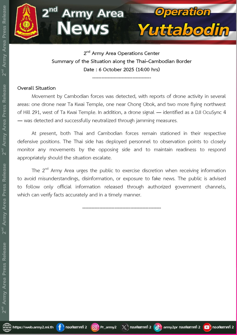 2nd Army Area Operations Center Summary of the Situation along the Thai–Cambodian Border Date : 6 October 2025 (14:00 hrs)