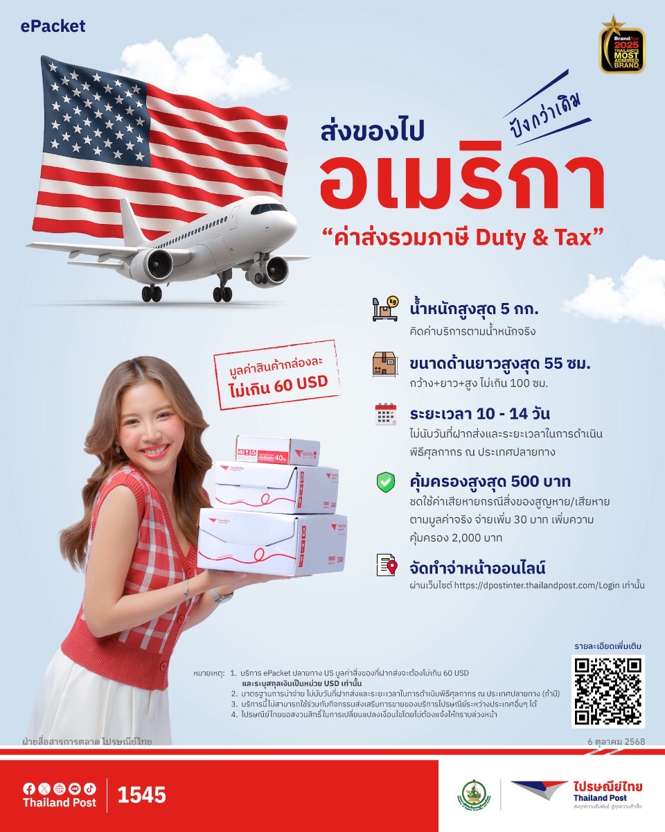 วันที่ 6 ตุลาคม 2568 บริษัท ไปรษณีย์ไทย จำกัด เดินหน้ายกระดับบริการขนส่งระหว่างประเทศตอบโจทย์ลูกค้าธุรกิจและอีคอมเมิร์ซที่ต้องการส่งสินค้าไปประเทศสหรัฐอเมริกา โดยจะเริ่มให้บริการ ‘ePacket’ สำหรับการส่งสิ่งของและสินค้าไปยังสหรัฐฯ สามารถส่งได้น้ำหนักสูงสุด 5 กิโลกรัม จากเดิมเพียง 2 กิโลกรัม พร้อมเพิ่มความคุ้มค่าด้วยราคาพิเศษที่รวมค่าภาษีขาเข้าแล้ว ในอัตราค่าขนส่งคงเดิม เพื่อให้ผู้ส่งบริหารจัดการต้นทุนและค่าส่งได้อย่างมั่นใจยิ่งขึ้น สำหรับสินค้าที่มีมูลค่าเกิน 60 เหรียญสหรัฐฯ ต่อกล่อง ลูกค้าสามารถเลือกใช้บริการ Courier Post ส่งด่วนพรีเมียมทั่วโลก เริ่มแล้วตั้งแต่วันนี้เป็นต้นไป