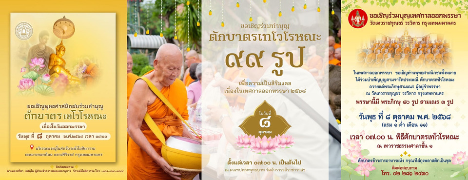 ปีนี้ วัดสำคัญหลายแห่งในกรุงเทพมหานครต่างพร้อมใจจัดพิธี “ตักบาตรเทโว” เพื่อเปิดโอกาสให้พุทธศาสนิกชนได้ร่วมใส่บาตรข้าวสารอาหารแห้ง ทำบุญใหญ่ และสืบสานประเพณีอันงดงามของชาวพุทธ