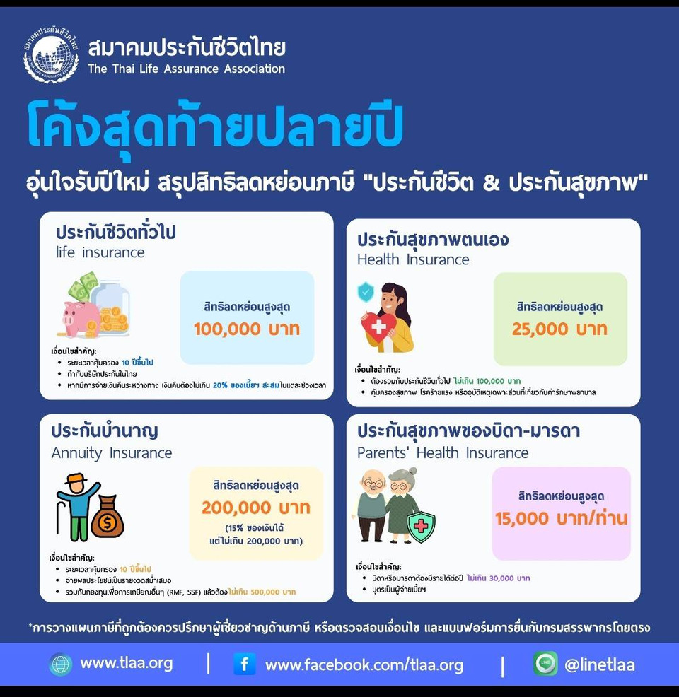 ประกันไม่ได้มีแค่คุ้มครอง แต่ช่วย "ลดหย่อนภาษี" นอกจากความคุ้มครองแล้ว ภาครัฐยังสนับสนุนการออมและการทำประกันชีวิตและประกันสุขภาพในระยะยาว โดยมีรายละเอียดการใช้สิทธิลดหย่อนภาษีเงินได้บุคคลธรรมดาที่น่าสนใจ ดังนี้ :