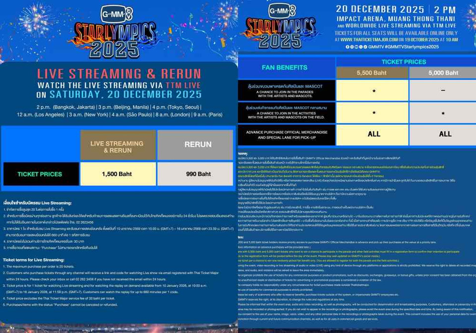 สำหรับผู้ที่สนใจเข้าร่วมงาน “GMMTV STARLYMPICS 2025” สามารถจับจองบัตรบนช่องทางOnline ในวันอาทิตย์ที่ 19 ตุลาคมนี้ เริ่มเวลา 10:00 น. เป็นต้นไป เปิดจำหน่ายทุกที่นั่ง ทางออนไลน์ที่www.thaiticketmajor.com เท่านั้น และเปิดจำหน่ายบัตรทุกช่องทางตามปกติ ในวันจันทร์ที่ 20 ตุลาคมนี้ เริ่มเวลา10:00 น. เป็นต้นไป ทางไทยทิคเก็ตเมเจอร์ทุกสาขา, www.thaiticketmajor.com และ Call center โทร 0-2262-3456 และดูสดผ่าน TTM LIVE กรณีต้องการรับบัตรพลาสติกที่ระลึก ชำระเพิ่ม 30 บาทต่อใบ