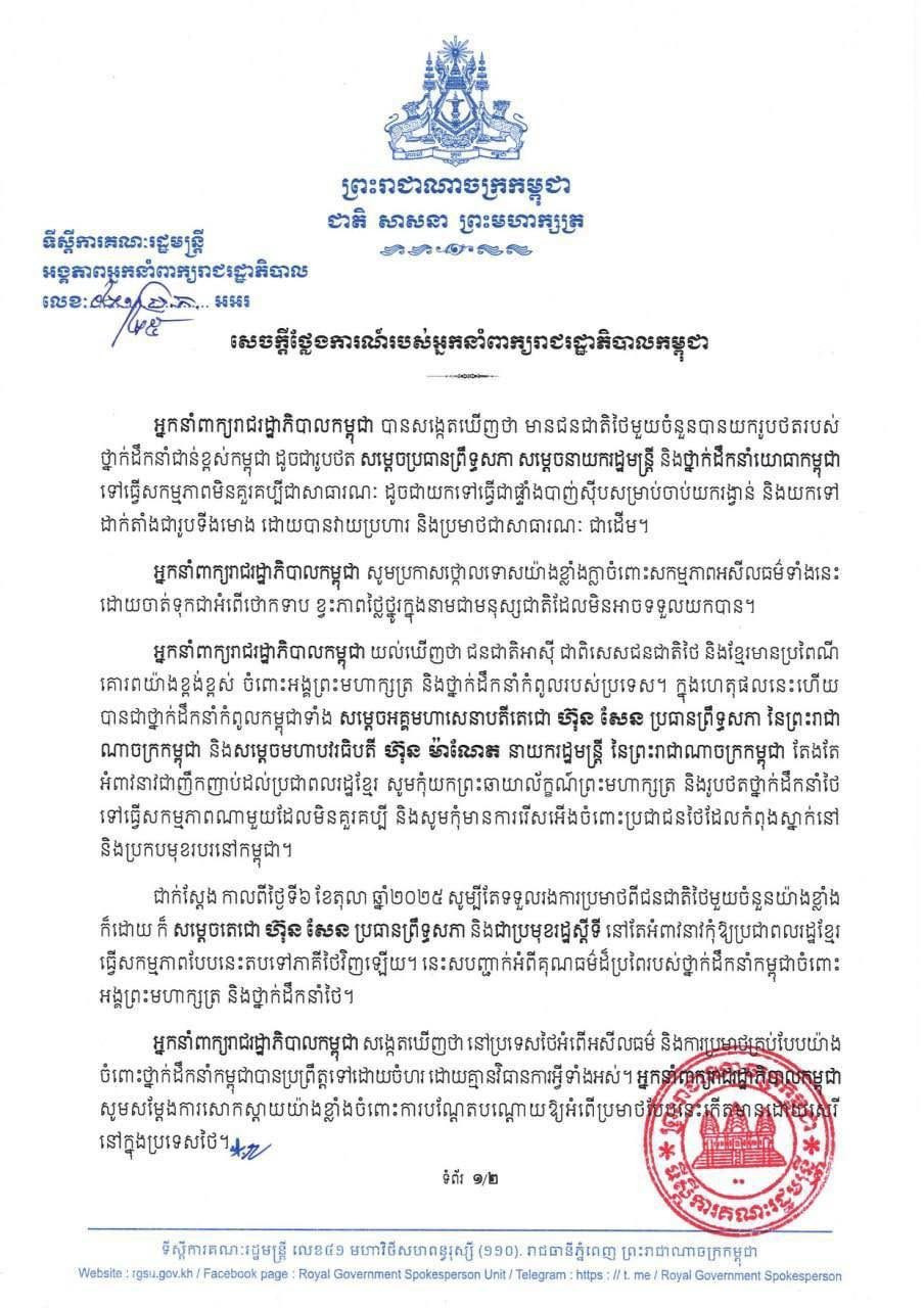 วันที่ 7 ตุลาคม 2568 แถลงการณ์จากรัฐบาลราชอาณาจักรกัมพูชา ระบุว่า เมื่อเร็วๆ นี้ กลุ่มบุคคลบางกลุ่มในประเทศไทยได้กระทำการที่ไม่เหมาะสมโดยการนำภาพของผู้นำระดับสูงของกัมพูชา เช่น สมเด็จฯ ฮุน เซน ประธานวุฒิสภา, นายกรัฐมนตรีฮุน มาเนต, และผู้นำทางทหารคนอื่นๆ ไปใช้เป็นเป้ายิงปืนเพื่อชิงรางวัล หรือนำไปติดไว้กับหุ่นไล่กา โดยให้มีการทุบตีและดูหมิ่นด้วยถ้อยคำหยาบคายในที่สาธารณะ