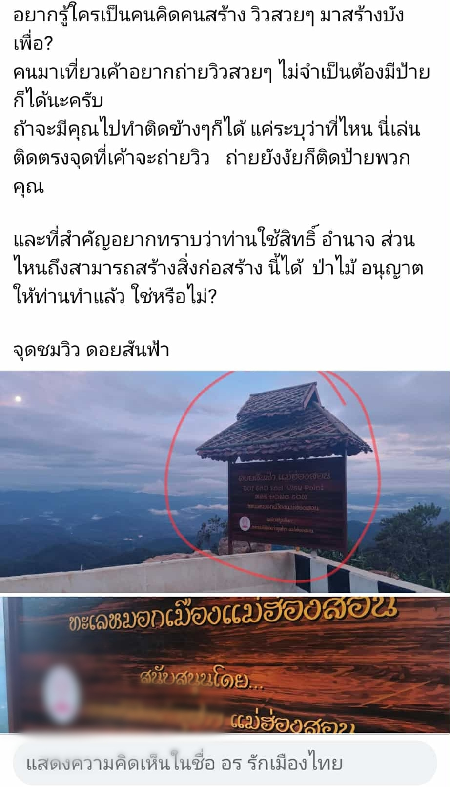 ดราม่าสนั่นเมือง!! หลังครีเอเตอร์เดินทางไปถ่ายรูปจุดชมวิวดอยสันฟ้า ต.ห้วยปูลิง อ.เมืองแม่ฮ่องสอน จ.แม่ฮ่องสอน ซึ่งเป็นจุดชมวิวแห่งใหม่ของเมืองแม่ฮ่องสอน พบมีการติดป้ายบดบังทัศนียภาพ มีแต่คนถามว่าใช้สมองส่วนใหนคิด