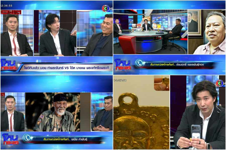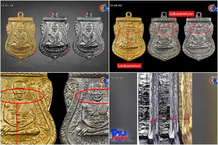 โอ๊ต : ครั้งแรกสร้างปี 08 มีบล็อกผ่าปาก มีเนื้อเงิน เนื้อทองคำ หนังสือพระทุกเล่มลง คนในพื้นที่เคยเห็นเคยขาย จากปี 08 พอมาทำอีกครั้งนึง ซึ่งเป็นบล็อกเริ่มแตกแล้ว หน้าไม่ใช่บล็อกผ่าปาก ถ้าเหรียญนี้มีทองคำ ทำไมไม่มีเงิน ถ้าเมื่อไหร่พระรูปนั้นมีเนื้อพิเศษ ทำไมมีอัลปาก้าแล้วไปมีทองคำเลย จริงๆ เงินก็ต้องมี เพราะบล็อกผ่าปากมีเงิน และมีทองคำแต่ไม่เป็นไร ผมผ่านตรงนั้นให้ไป ผมคิดว่าการทำรายการทีวี เชื่อว่าผู้ฟังได้ประโยชน์ ผมอยากให้ทุกคนได้ประโยชน์ เพราะทุกครั้งที่มีดราม่าพระเครื่อง คนมีความรู้ไม่เท่ากัน เขาจึงคอมเมนต์เสียงแตก ถ้าคนทุกคนมีความรู้เท่ากัน พระเครื่องคอมเมนต์จะเสียงไม่แตก ขณะที่ผมอธิบายการสร้างพระแบบของแท้ กับการผลิตพระแบบของเก๊ ถ้าคุณบอยหรือเพื่อนๆ สงสัยอะไร แทรกผมกลางรายการได้เลย ผมจึงบอกว่าพระแท้คือเอกสารตัวจริงที่พิมพ์ดีดมา พระเก๊คือการถ่ายเอกสาร ทำไมมองจากภาพแล้วมองว่าพระเหรียญนี้ไม่ได้สร้างในปี 2508 การจำขอบ จำตำหนิ หรือจำตัวตัดจุดใดจุดนึง ผมเคยเจอกับตัวเองมาแล้ว ผมเป็นประธานพระเครื่องดูแลภาคตะวันตกทั้งหมด เวลามีเหรียญที่คนในชมรมผมถกเถียงกัน โดยการเอาฟันของเขี้ยวตัวตัดมาเทียบ มันเหมือนกันในบางจุดนะครับ แต่เหรียญเล็กกับใหญ่เลย เป็นไปได้มั้ยว่าเหรียญเล็กกับใหญ่จะตัดจากตัวตัดเดียวกัน บางคนฟังอาจจะงง ลักษณะตัวตัดถ้าตัวตัดเดียวกัน ก็จะผ่านช่องซึ่งเป็นตัวบังคับ เส้นรอบวงต้องเท่ากัน ไม่ว่าเอาอะไรผ่านตัวนี้ เส้นรอบวงต้องเท่ากัน เราย้อนกลับไปดูเหรียญทองคำ ตัวตัดเอาทิ้งไปเลย ผมบอกเลย ถ้าเหรียญนี้เป็นตัวตัดเดียวกันกับ 08 หน้าเลื่อนอัลปาก้านะ ผมบอกเลย ยกกล้องให้แล้วเลิกเล่นพระด้วย ออกจากประธานชมรมให้ด้วย ถ้าเหรียญทองคำนี้เป็นตัวตัดเดียวกับเหรียญ 08 อัลปาก้า ผมยกกล้องให้อ.รักษ์และผมเลิกเล่นพระด้วย