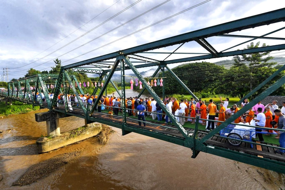 อำเภอปาย ร่วมกับองค์การบริหารส่วนตำบลแม่ฮี้ องค์การบริหารส่วนตำบลทุ่งยาว และ ชมรมกำนัน ผู้ใหญ่บ้านอำเภอปาย ทำบุญตักบาตรเทโวโรหณะ พระสงฆ์ 79 รูป ย้อนรอยประวัติศาสตร์ 2458 สะพานประวัติศาสตร์ปาย