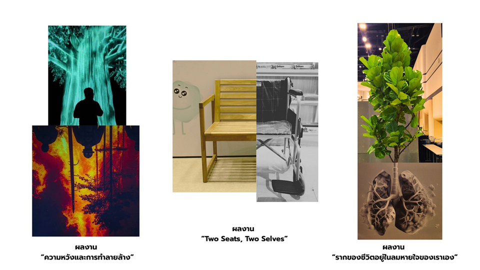 ขณะที่นายเชษฐกานต์ นุ่มเหลือ นักศึกษาชั้นปีที่ 1 สาขาออกแบบเชิงสร้างสรรค์ คณะศิลปกรรมศาสตร์ มหาวิทยาลัยธุรกิจบัณฑิตย์ 1 ใน 13 ผู้ ที่ได้รับรางวัล ได้นำเสนอผลงานภาพคู่ชื่อ “รากของชีวิตอยู่ในลมหายใจของเราเอง” เป็นการถ่ายทอดการเชื่อมโยง “ปอด” ที่เป็นส่วนสำคัญในการดำรงชีวิตของเรา ส่วนต้นไม้ก็ใช้รากในการดำรงชีวิตเหมือนกัน แม้จะต่างกันสุดขั้ว แต่ทำหน้าที่เดียวกันคือทำให้เรา ‘มีชีวิต’ ต่อไป