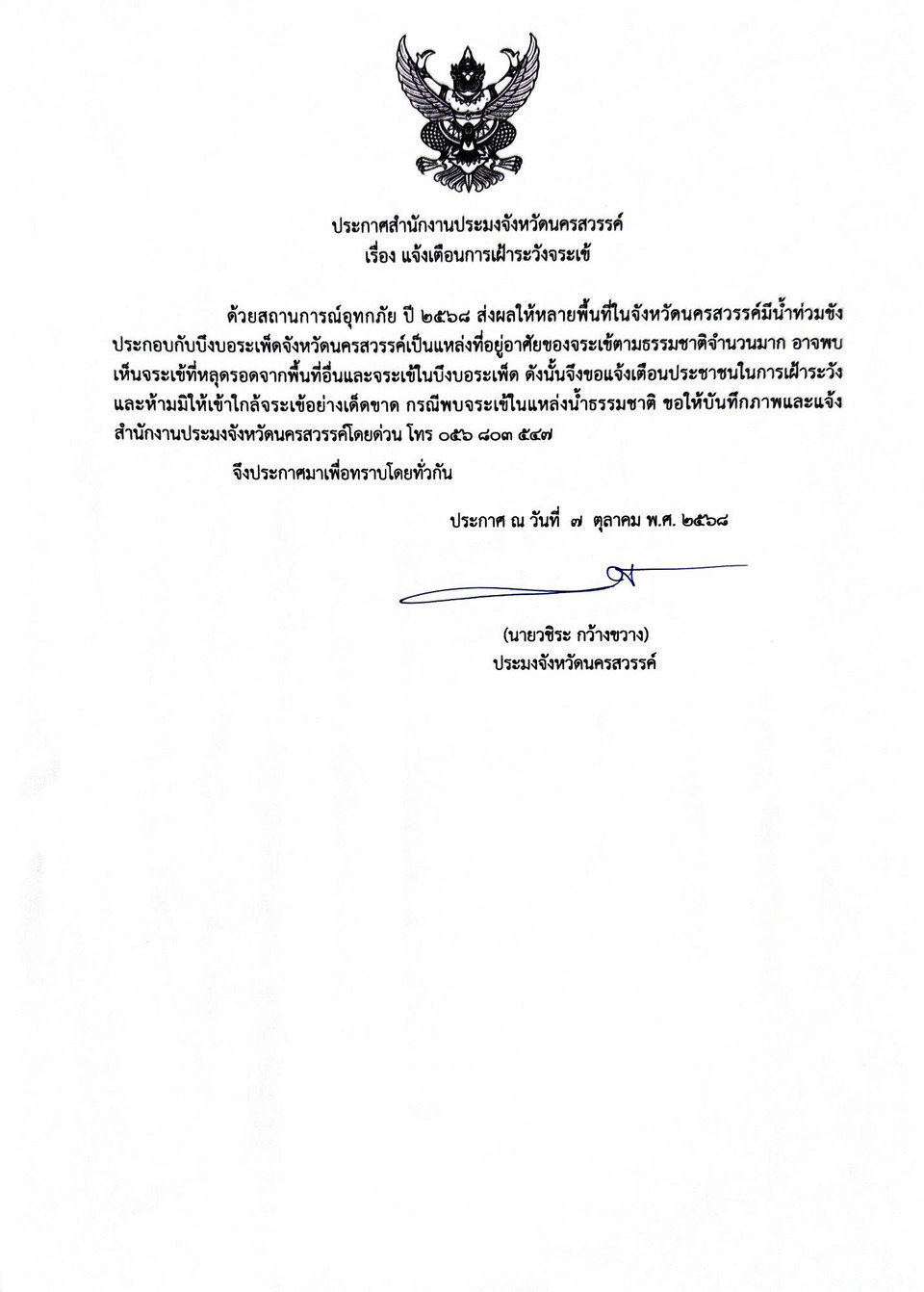 ด้วยสถานการณ์อุทกภัย ปี 2568 ส่งผลให้หลายพื้นที่ในจังหวัดนครสวรรค์ มีน้ำท่วมขัง ประกอบกับบึงบอระเพ็ด จังหวัดนครสวรรค์ เป็นแหล่งที่อยู่อาศัยของจระเข้ตามธรรมชาติจำนวนมาก อาจพบเห็นจระเข้ที่หลุดรอดจากพื้นที่อื่น และจระเข้ในบึงบอระเพ็ด ดังนั้นจึงขอแจ้งเตือนประชาชนในการเฝ้าระวังและห้ามมิให้เข้าใกล้จระเข้อย่างเด็ดขาด กรณีพบจระเข้ในแหล่งน้ำธรรมชาติ ขอให้บันทึกภาพ และแจ้งสำนักงานประมงจังหวัดนครสวรรค์โดยด่วน โทร 056-803547