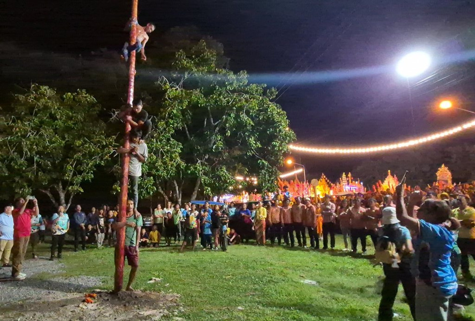 แต่ไฮไลท์ที่เรียกเสียงเฮสนั่นงาน ต้องยกให้ “การแข่งขันปีนเสาน้ำมัน” ที่ทั้งยาก ทั้งมัน และทั้งฮา เสาไม้สูงทาน้ำมันและจาระบีจนลื่นเป็นมัน ทำให้ผู้เข้าแข่งขันต้องใช้ทั้งแรงและเทคนิคพิเศษในการปีนขึ้นไปคว้าเงินรางวัล 2,000 บาท บนยอดเสา ปีนี้มีเพียงสองทีมกล้าเข้าชิงชัยจาก หมู่บ้านปลายชล และ หมู่บ้านเขาจีน เรียกเสียงหัวเราะและแรงเชียร์จากผู้ชมรอบสนามอย่างต่อเนื่อง