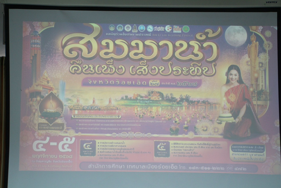วันที่ 8 ตุลาคม 2568 ที่ห้องประชุมพระมหาเจดีย์ชัยมงคล ชั้น 5 ศาลากลางจังหวัดร้อยเอ็ด นายชัชวาลย์ เบญจสิริวงศ์ ผู้ว่าราชการจังหวัดร้อยเอ็ด มอบหมายให้ นายพิชัยยา ตุระซอง รองผู้ว่าราชการจังหวัดร้อยเอ็ด เป็นประธานการประชุมเตรียมความพร้อมการจัดงานประเพณี “สมมาน้ำ คืนเพ็ง เส็งประทีป” ครั้งที่ 27 ประจำปี 2568 โดยมี หัวหน้าส่วนราชการ และหน่วยงานที่เกี่ยวข้อง เข้าร่วม