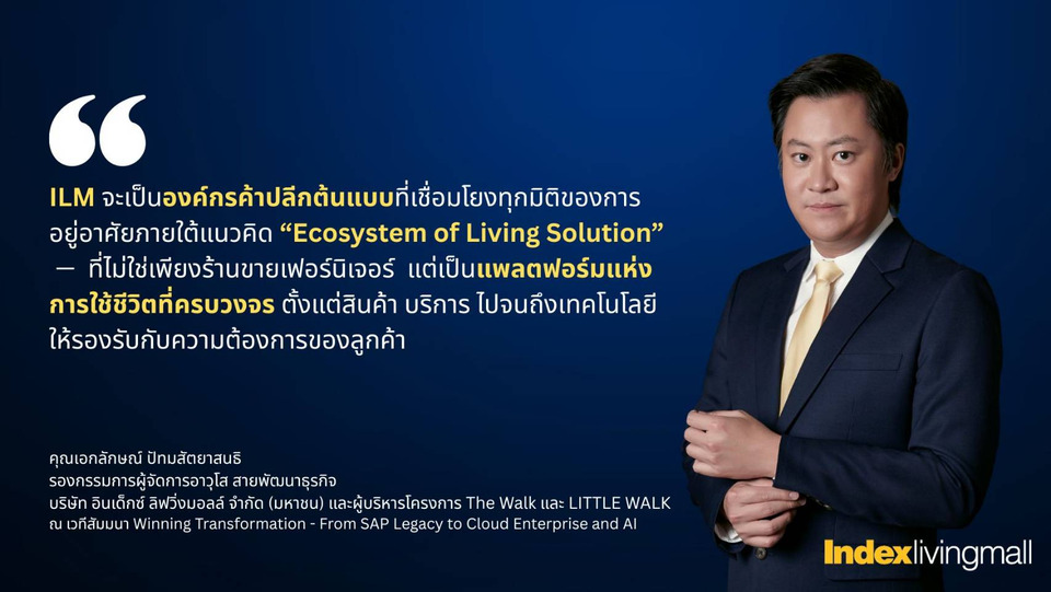 ในยุคที่การแข่งขันบนสนามธุรกิจค้าปลีกเปลี่ยนจากการสู้กันด้วยราคาและทำเล สู่สมรภูมิแห่งดิจิทัล, ข้อมูล และเทรนด์ ท่ามกลางการเปลี่ยนแปลงอย่างรวดเร็ว อินเด็กซ์ ลิฟวิ่งมอลล์ (ILM) ผู้นำธุรกิจร้านค้าปลีกเฟอร์นิเจอร์ ของใช้ภายในบ้าน และของแต่งบ้านครบวงจร ที่ครองอันดับ 1 ด้านสินค้าไลฟ์สไตล์เรื่องบ้านมาอย่างยาวนาน ได้ประสบความสำเร็จสู่การก้าวขึ้นเป็นผู้นำธุรกิจยุคใหม่ด้วยการทรานส์ฟอร์มองค์กรสู่ Digital-Driven Future ผ่านการใช้ RISE with SAP S/4HANA Cloud for Retail ด้วยการสนับสนุนของ 4 ผู้นำด้านเทคชั้นนำอย่าง SAP, NEXUS, SNP Group และ AWS เพื่อสร้างรากฐานดิจิทัลอัจฉริยะ และขับเคลื่อนด้วย SAP Cloud, AI และ Data Intelligence ที่เชื่อมโยงทุกมิติของธุรกิจ
