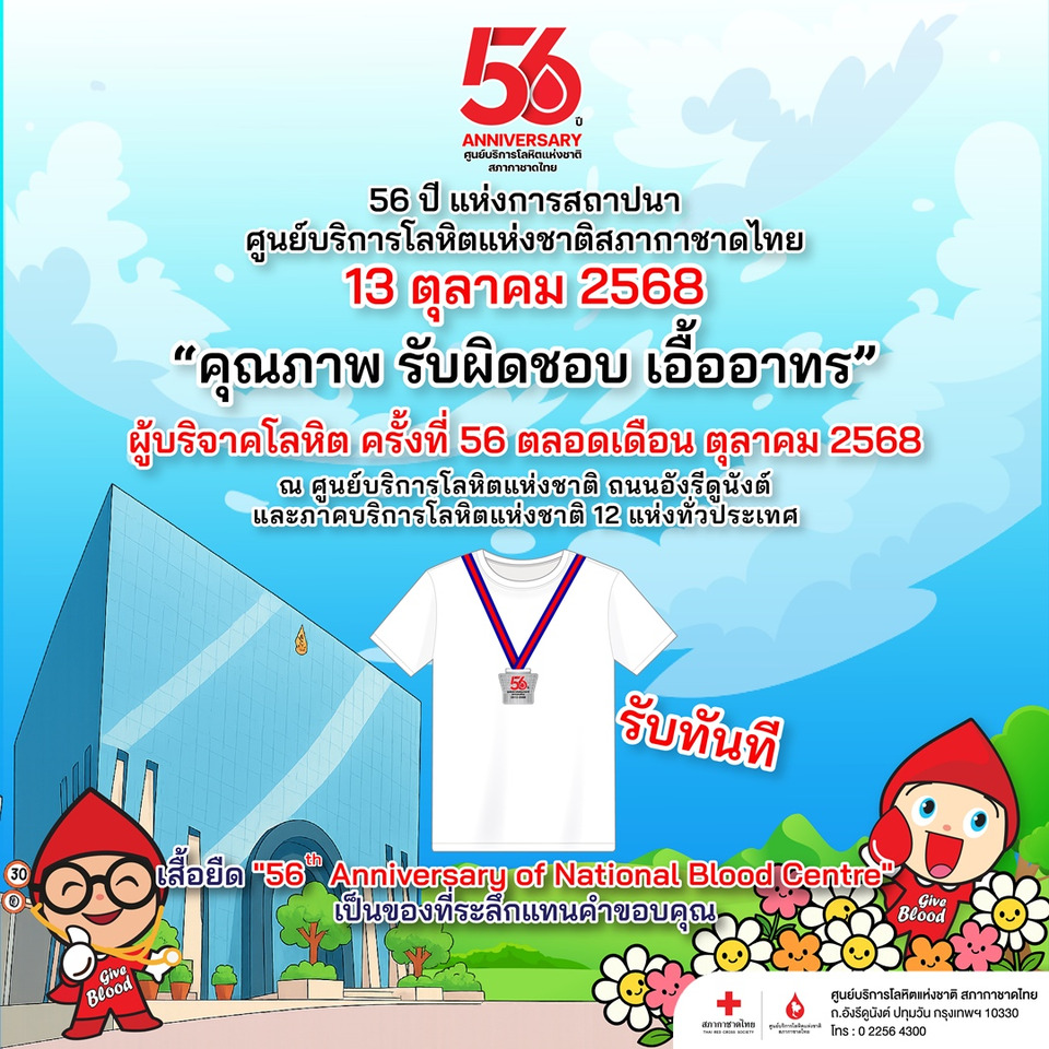 ในวาระโอกาสครบรอบ 56 ปี แห่งการสถาปนาศูนย์บริการโลหิตแห่งชาติ จัดกิจกรรมเชิญชวนประชาชนทั่วไป หน่วยงานภาครัฐ รัฐวิสาหกิจ และภาคเอกชน ทั่วประเทศ ร่วมบริจาคโลหิตช่วยเหลือผู้ป่วย ส่งผลให้มีโลหิตสำรองคงคลังเพียงพอสำหรับโรงพยาบาลทั่วประเทศ พิเศษ ! สำหรับผู้ที่บริจาคโลหิตครบ 56 ครั้ง ในเดือนตุลาคม 2568 ณ ศูนย์บริการโลหิตแห่งชาติ รับทันทีเสื้อยืด “56th Anniversary National Blood Centre” เป็นที่ระลึก