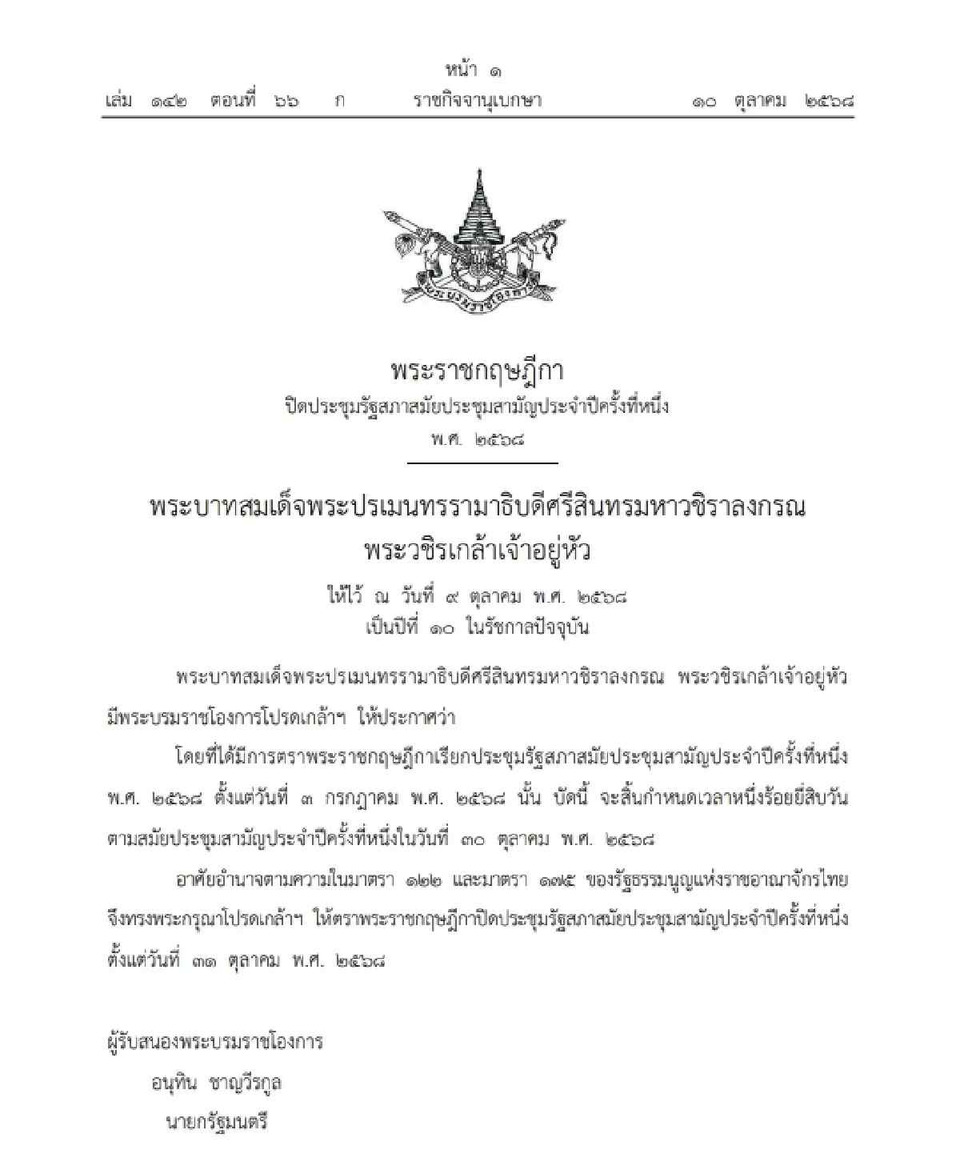 อาศัยอำนาจตามความในมาตรา 122 และมาตรา 175 ของรัฐธรรมนูญแห่งราชอาณาจักรไทย จึงทรงพระกรุณาโปรดเกล้าฯ ให้ตราพระราชกฤษฎีกาปิดประชุมรัฐสภาสมัยประชุมสามัญประจำปีครั้งที่หนึ่ง ตั้งแต่วันที่ 31 ตุลาคม พ.ศ. 2568