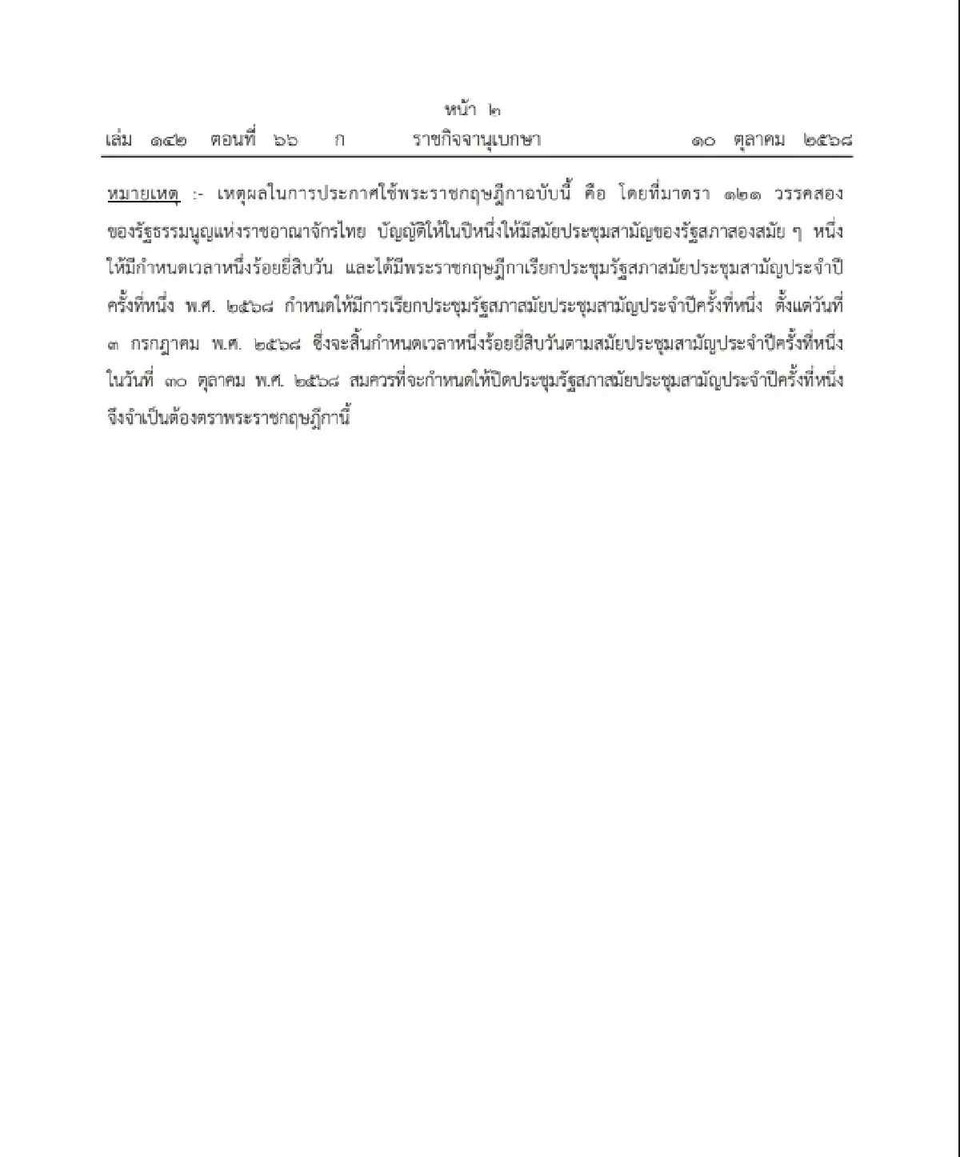 โดยที่ได้มีการตราพระราชกฤษฎีกาเรียกประชุมรัฐสภาสมัยประชุมสามัญประจำปีครั้งที่หนึ่ง พ.ศ. 2568 ตั้งแต่วันที่ 3 กรกฎาคม พ.ศ. 2568 นั้น บัดนี้ จะสิ้นกำหนดเวลาหนึ่งร้อยยี่สิบวันตามสมัยประชุมสามัญประจำปีครั้งที่หนึ่งในวันที่ 30 ตุลาคม พ.ศ. 2568