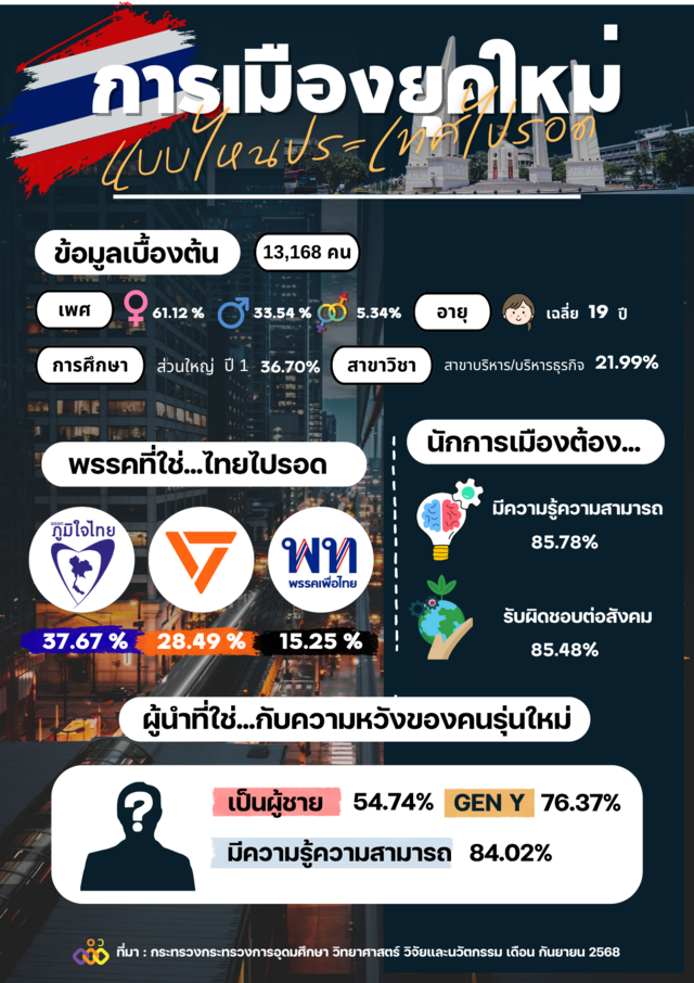 วันที่ 10 ต.ค.68 ผู้สื่อข่าวรายงานว่า กระทรวงการอุดมศึกษา วิทยาศาสตร์ วิจัยและนวัตกรรม เปิดเผยผลสำรวจ ช่วงเดือน ก.ย. 2568 ในประเด็นความคิดเห็นของนิสิต/นักศึกษาระดับปริญญาตรี ในประเด็น “การเมืองยุคใหม่: แบบไหนประเทศไปรอด?” โดยเก็บข้อมูลจากมหาวิทยาลัยทั่วประเทศ รวมจำนวน 13,168 คน พบว่า
