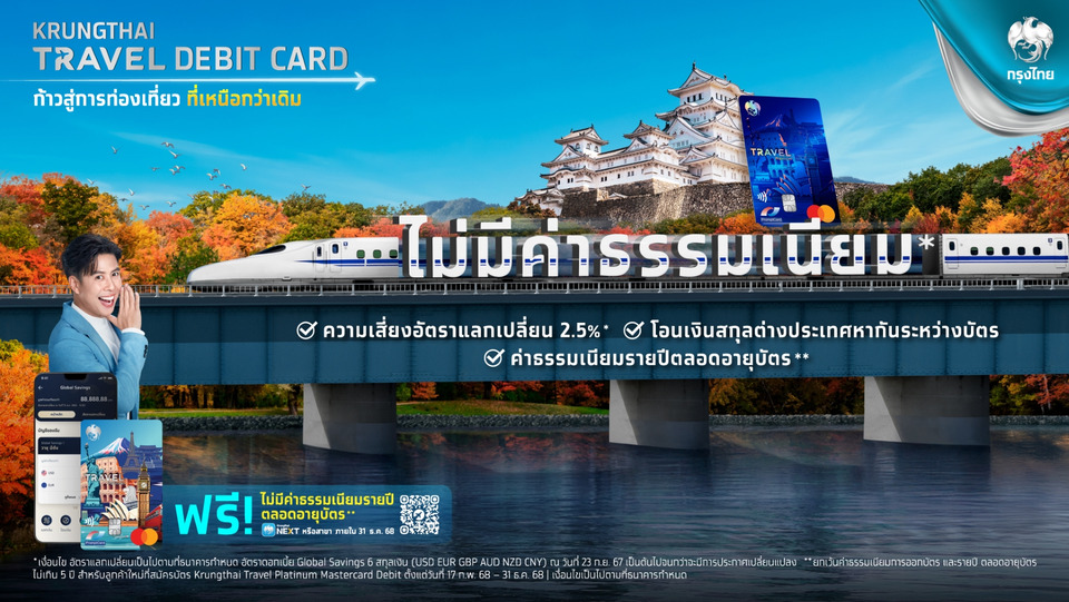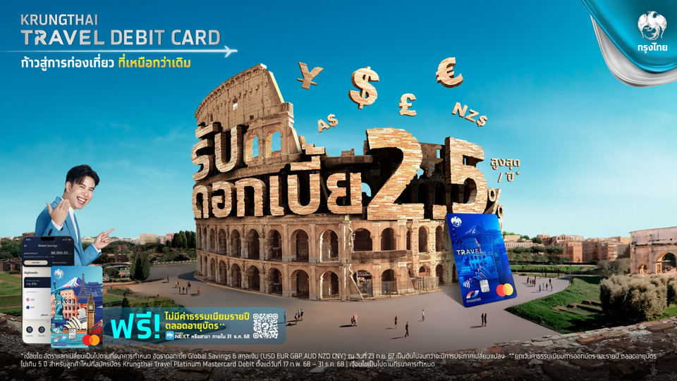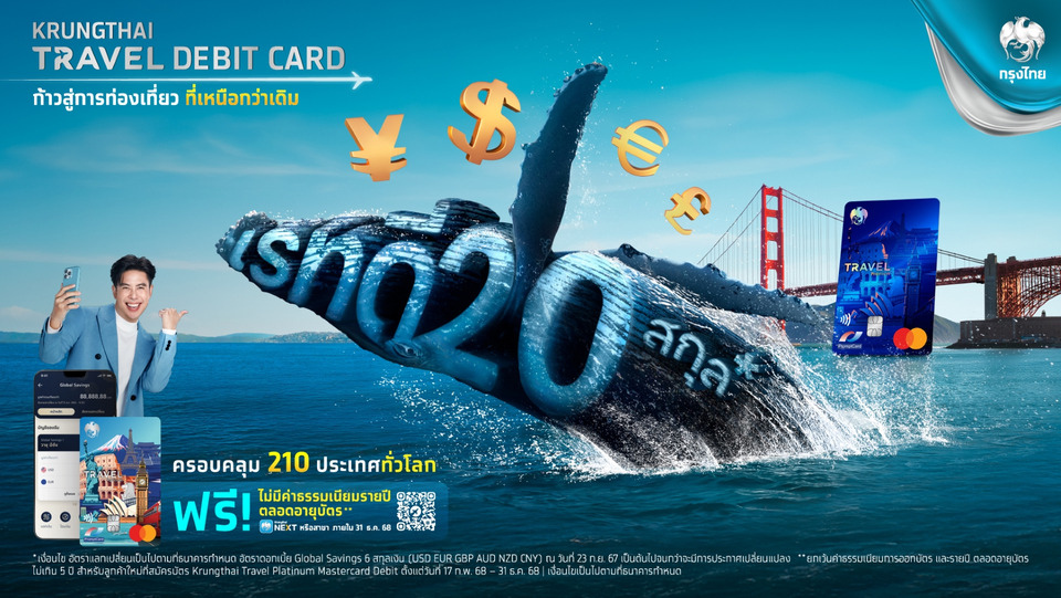วันที่ 10 ตุลาคม 2568 ธนาคารกรุงไทย มอบประสบการณ์เหนือระดับ บัตร Krungthai Travel Debit ตอบโจทย์ลูกค้าที่วางแผนเดินทางท่องเที่ยว ด้วยแนวคิด “เปลี่ยนจาก Tourist ธรรมดา สู่ TouRICH” ที่สุดแห่งประสบการณ์เดินทาง เหนือกว่าด้วย Cash Back สูงสุด 10,000 บาทต่อปี แลกเงินเรทดี 20 สกุลเงินชั้นนำ รับอัตราดอกเบี้ย เงินฝากสูงสุด 2.5% ต่อปี เมื่อแลกเงินเก็บในบัญชีสกุลต่างประเทศ Global Savings โอนเงินระหว่างบัตรไม่เสียค่าธรรมเนียม เติมเต็มทุกการเดินทางให้คุ้มค่ามากยิ่งขึ้น