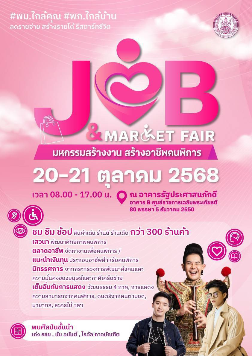 อย่างไรก็ตาม ขอเชิญชวนพี่น้องประชาชนร่วมให้กำลังใจ ให้โอกาสแก่คนพิการ ได้ก้าวข้ามข้อจำกัดความพิการ และก้าวสู่ชีวิตใหม่อย่างมั่นคง สู่สังคมที่ไม่ทิ้งใครไว้ข้างหลัง ในงาน Job and Market Fair : มหกรรมสร้างงาน สร้างอาชีพคนพิการ” ระหว่างวันที่ 20 - 21 ตุลาคม 2568 ณ อาคารรัฐประศาสนภักดี (อาคาร B) ศูนย์ราชการเฉลิมพระเกียรติ 80 พรรษาฯ กรุงเทพฯ