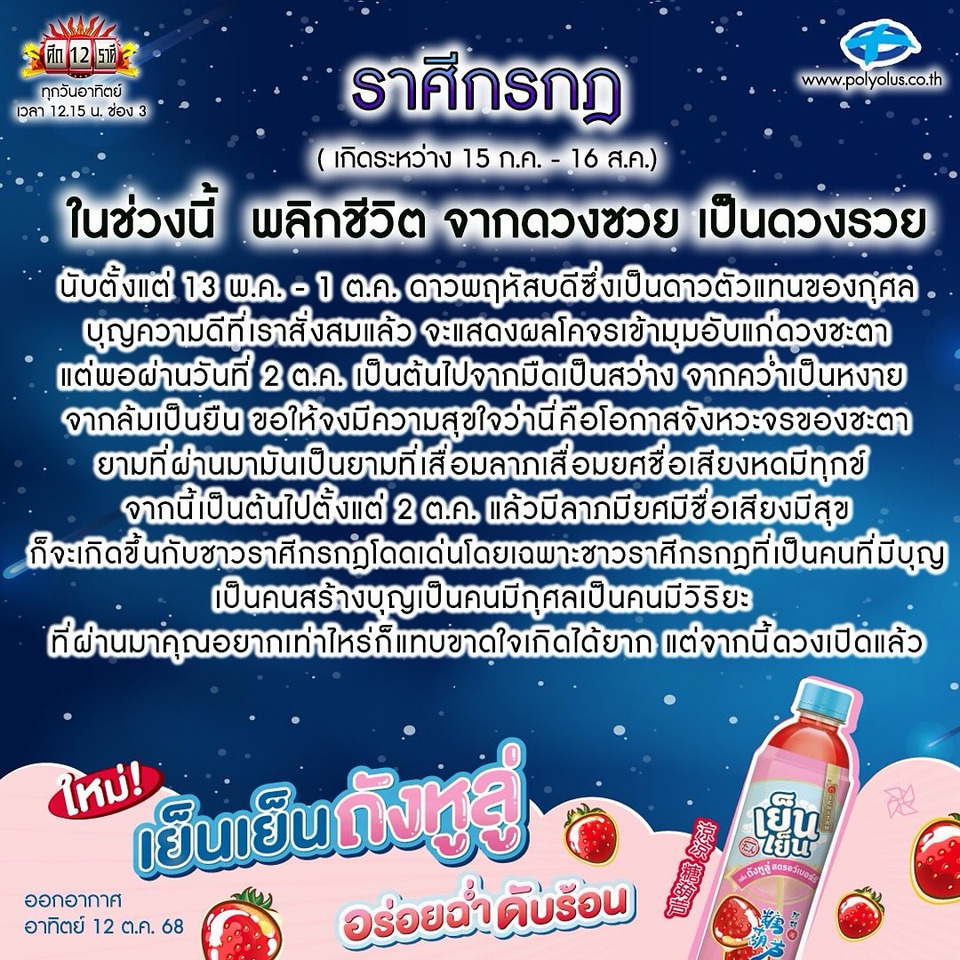 วันที่12 ต.ค.68 "ลักษณ์ ราชสีห์" หรือ "หมอลักษณ์ ฟันธง" หมอดูชื่อดังของเมืองไทย ทำนายดวงผ่านอินสตาแกรม @polyplus_jad_hai ระบุว่า...