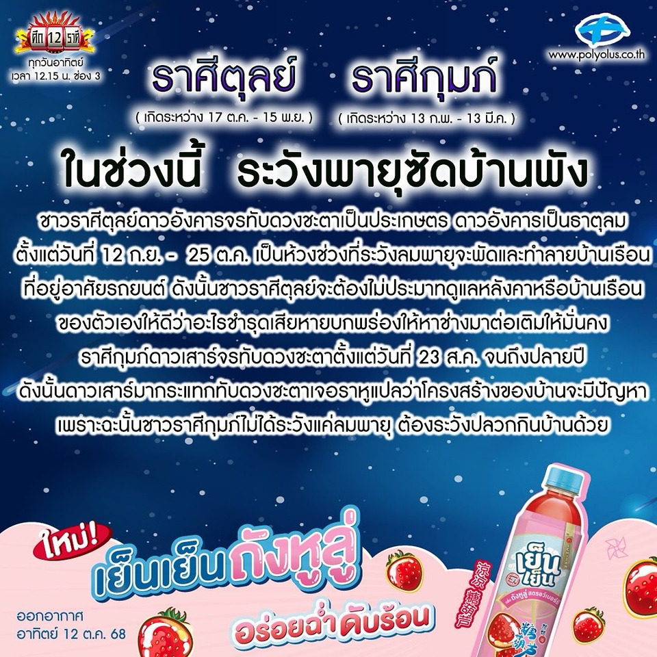วันที่ 12 ต.ค.68 "ลักษณ์ ราชสีห์" หรือ "หมอลักษณ์ ฟันธง" หมอดูชื่อดังของเมืองไทย ทำนายดวงผ่านอินสตาแกรม @polyplus_jad_hai ระบุว่า...