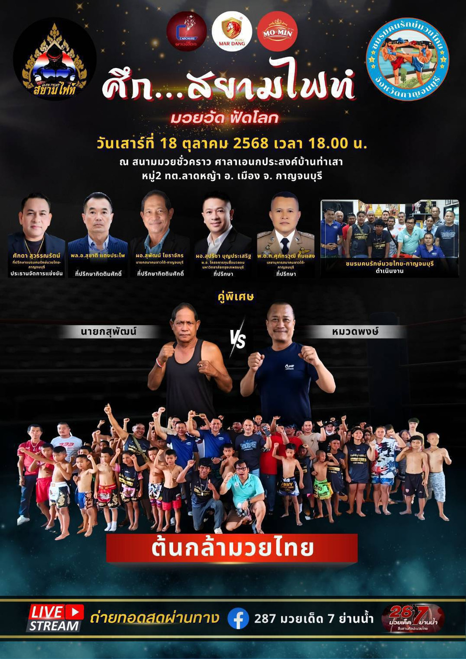 โดยเตรียมเปิดศึกครั้งยิ่งใหญ่ 18 ตุลาคมนี้ “ศึกสยามไฟท์ (ต้นกล้ามวยไทย) มวยวัดฟัดโลก” เวทีมวยสร้างสรรค์เพื่อส่งเสริมเยาวชนและนักมวยท้องถิ่นทั่วทั้ง 13 อำเภอของจังหวัดกาญจนบุรี จุดประกายพลัง “มวยไทยต้นกล้า” ให้เติบโตสู่เส้นทางอาชีพอย่างมั่นคง พร้อมขับเคลื่อนพลังเยาวชน สร้างอาชีพด้วยศิลปะแห่ง "มวยไทย" สู่ Soft Power ของชาติอย่างแท้จริง