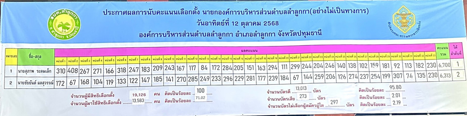 เมื่อวันที่ 12 ตุลาคม 2568 ที่องค์การบริหารส่วนตำบลลำลูกกา (อบต.ลำลูกกา) อำเภอลำลูกกา จังหวัดปทุมธานี ได้มีการเลือกตั้ง นายก อบต.ลำลูกกา ขึ้น โดยมีผู้สมัครจำนวน 2 คน ได้ แก่ นายสุภาพ ระดมเล็ก ผู้สมัครรับเลือกตั่งนายก อบต.ลำลูกกา หมายเลข 1 และเป็นอดีตนายกอบต.ลำลูกกา เป็นทีมงานของ พล.ต.ท.คำรณวิทย์ ธูปกระจ่าง นายก อบจ.ปทุมธานี แข่งขันกับนาย ชัยยันต์ ผลสุวรรณ์ อดีต ส.ส.ปทุมธานี พรรคเพื่อไทย ผู้สมัครนายก อบต.ลำลูกกา หมายเลข 2 ผลคะแนนอย่างไม่เป็นทางการปรากฎว่า นายสุภาพ ระดมเล็ก หมายเลข 1 ได้รับความไว้วางใจจากประชาชน ได้รับเลือกสุงสุด รักษาแชมป์ไว้ได้