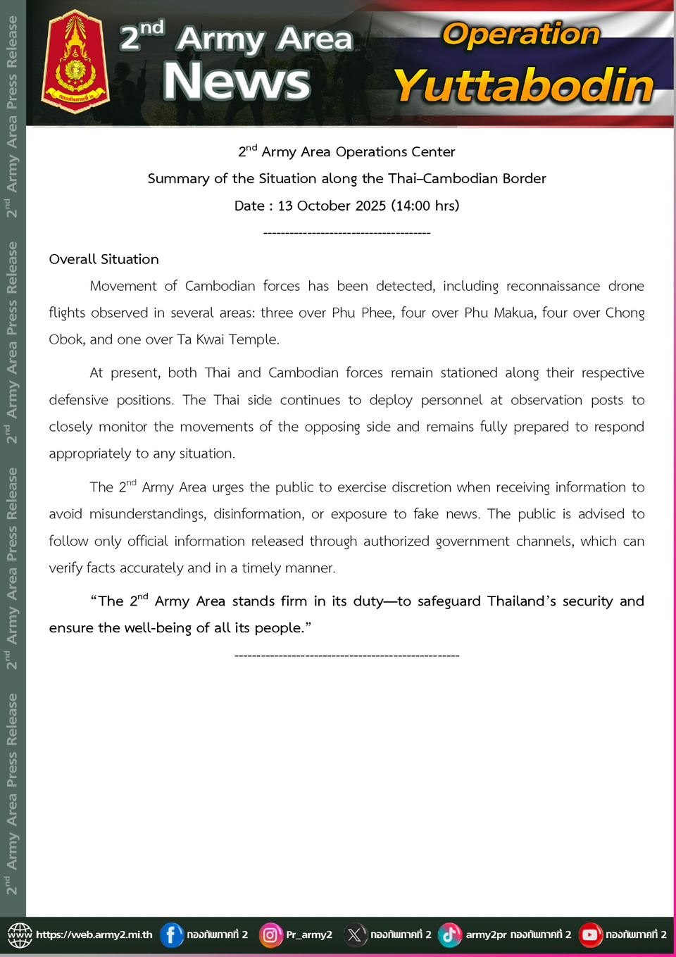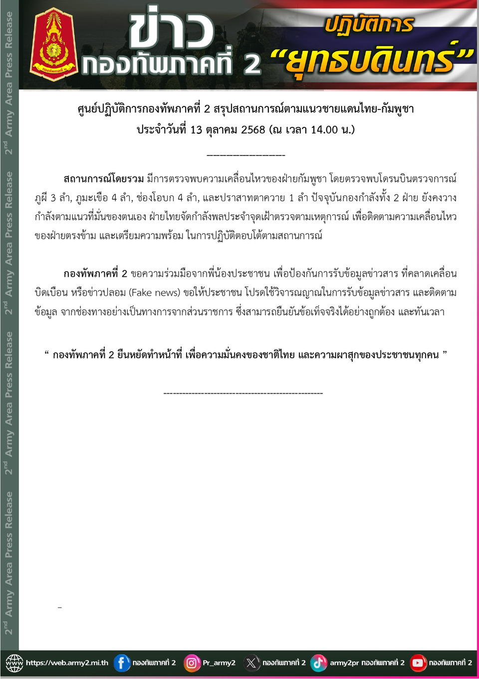 วันที่ 13 ต.ค.68 ศูนย์ปฏิบัติการกองทัพภาคที่ 2 สรุปสถานการณ์ตามแนวชายแดนไทย-กัมพูชา ประจำวันที่ 13 ตุลาคม 2568 (ณ เวลา 14.00 น.)