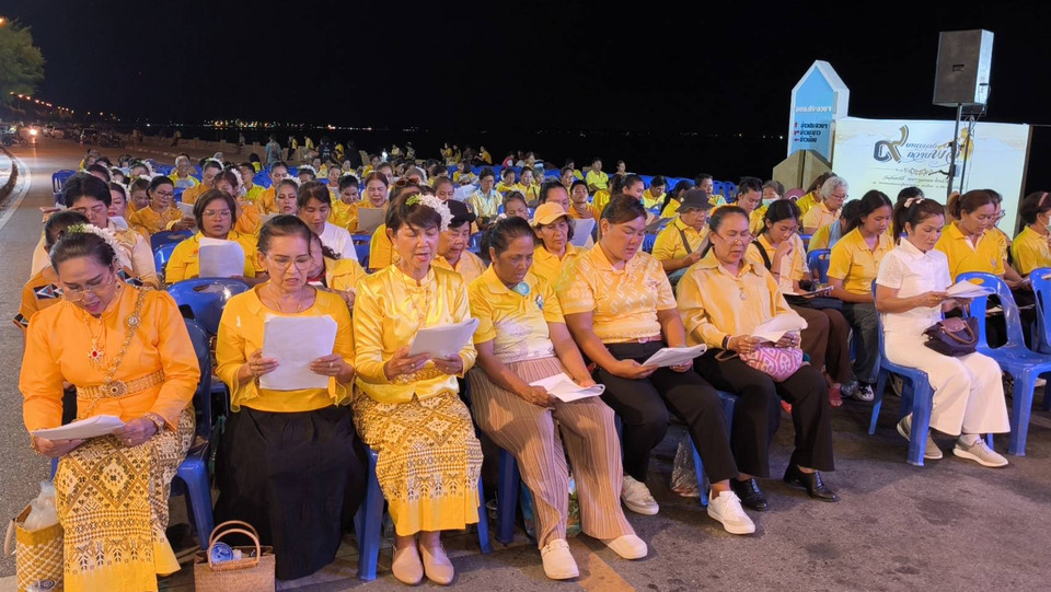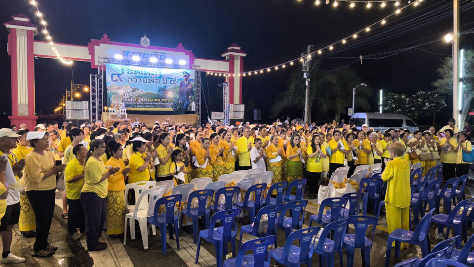 เมื่อวันที่ 13 ต.ค.68 เวลา 19.00 น. ที่วิหารพระอุปคุต บริเวณหน้าสะพานสราญวิถี ถนนเลียบชายหาดทะเลอ่าวประจวบคีรีขันธ์ อำเภอเมืองประจวบคีรีขันธ์ นายสิทธิชัย สวัสดิ์แสน ผู้ว่าราชการจังหวัดประจวบคีรีขันธ์ เป็นประธานในกิจกรรมขับขาน 9 บทเพลงถวายพ่อปีที่ 9 โดยมี พญ.บุษกร สวัสดิ์แสน ประธานแม่บ้านมหาดไทยจังหวัดประจวบคีรีขันธ์ นายประทีป บริบูรณ์รัตน์ นายปรีดา สุขใจ รองผู้ว่าราชการจังหวัดฯ พร้อมด้วย ผู้แทนนายอำเภอเมืองประจวบฯ หัวหน้าส่วนราชการ ข้าราชการ กลุ่มเพ็ญพุธประจวบ คณะผู้ก่อการดีย์ ผู้บริหารบริษัทห้องเย็น ป.ปนัฐดา อินเตอร์มารีนฟู้ด และประชาชนชาวจังหวัดประจวบฯ ได้พร้อมใจกันสวมใส่เสื้อสีเหลือง เข้าร่วมกิจกรรม ประมาณ 1000 คน