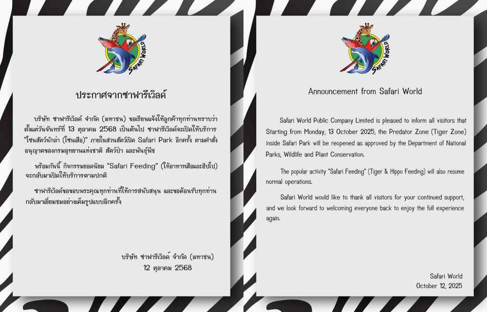 Safari World Public Company Limited is pleased to inform all visitors that Starting from Monday, 13 October 2025, the Predator Zone (Tiger Zone) inside Safari Park will be reopened as approved by the Department of National Parks, Wildlife and Plant Conservation.