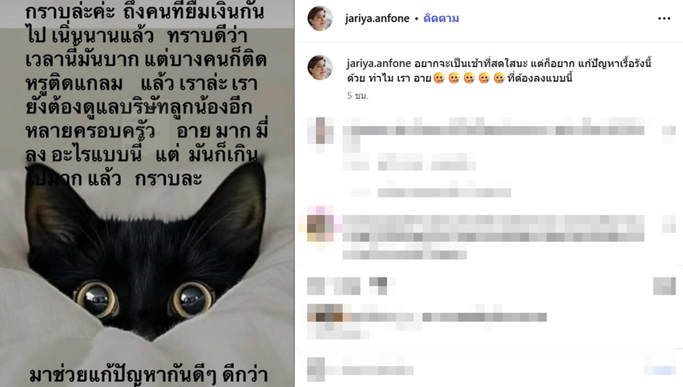 โดย นก จริยา ได้โพสต์ภาพข้อความว่า "กราบล่ะค่ะ ถึงคนที่ยืมเงินกันไป เนิ่นนานแล้ว ทราบดีว่าเวลานี้มันลำบาก แต่บางคนก็ติดหรูติดแกลม แล้วเราล่ะ เรายังต้องดูแลบริษัทลูกน้องอีกหลายครอบครัว อายมากที่ลงอะไรแบบนี้ แต่มันก็เกินไปมากแล้ว กราบละ มาช่วยแก้ปัญหากันดีๆ ดีกว่า"